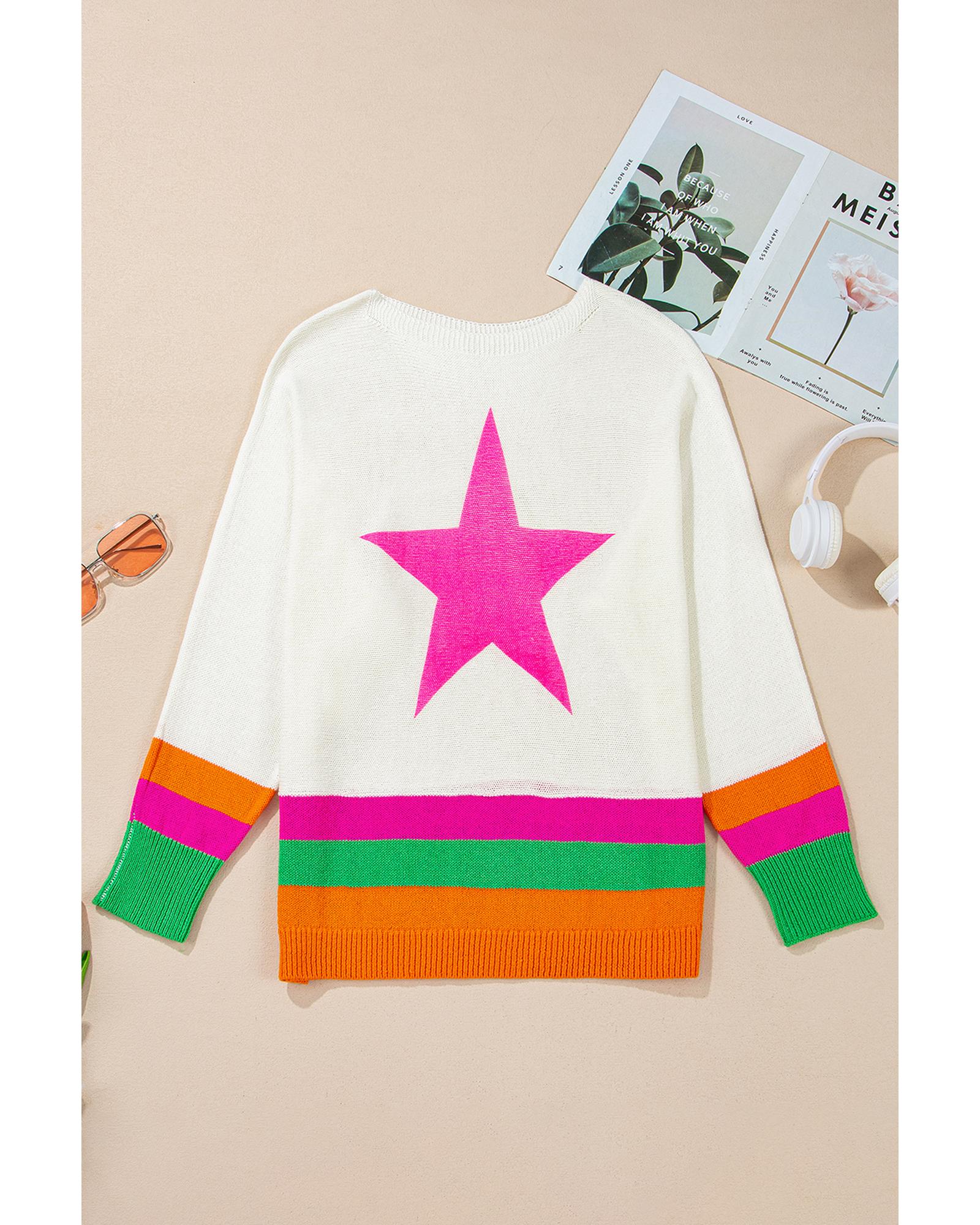 White Star Pattern Colorblock Striped Edge Drop Shoulder Sweater – XL