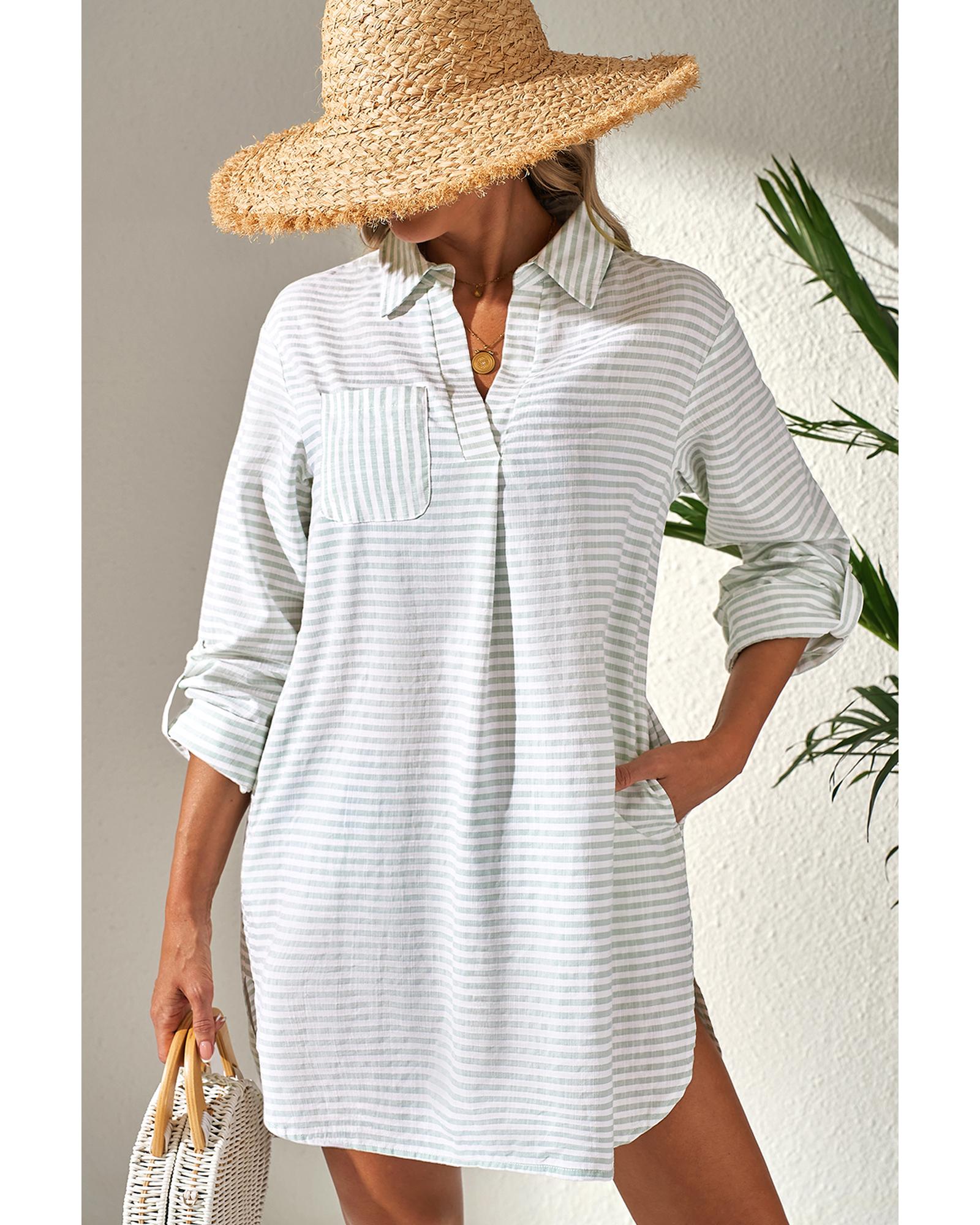 White Stripe Collared V Neck Chest Pocket Long Sleeve Beach Cover up – S