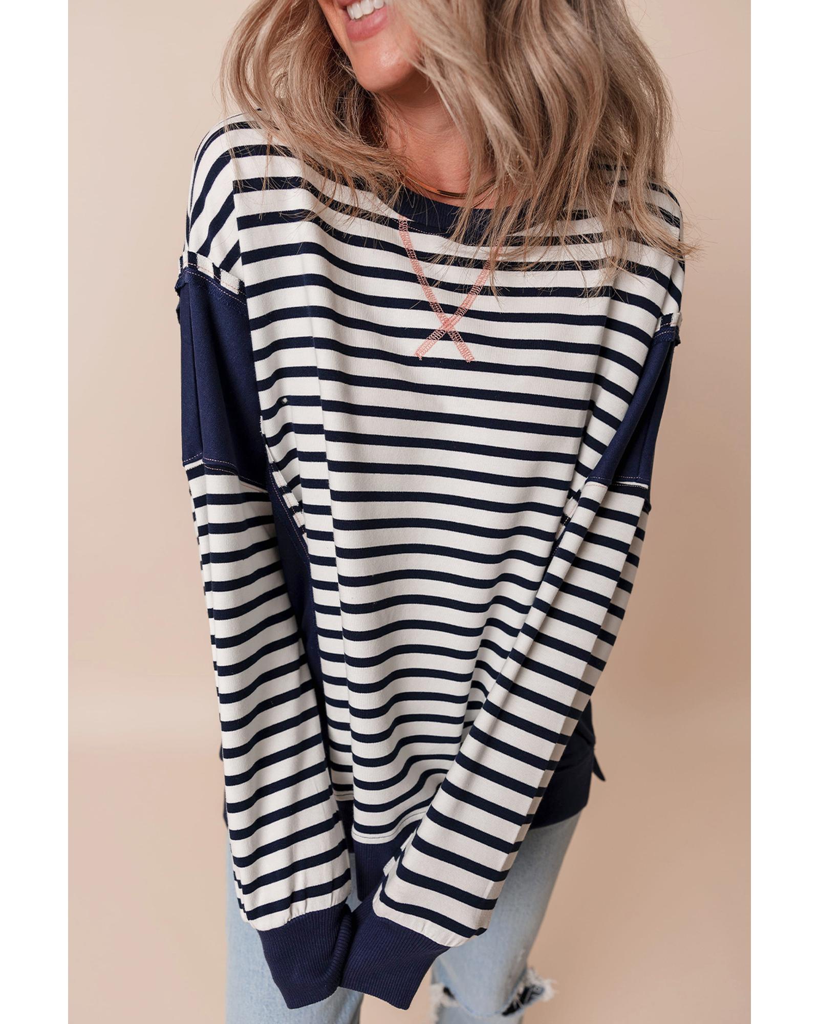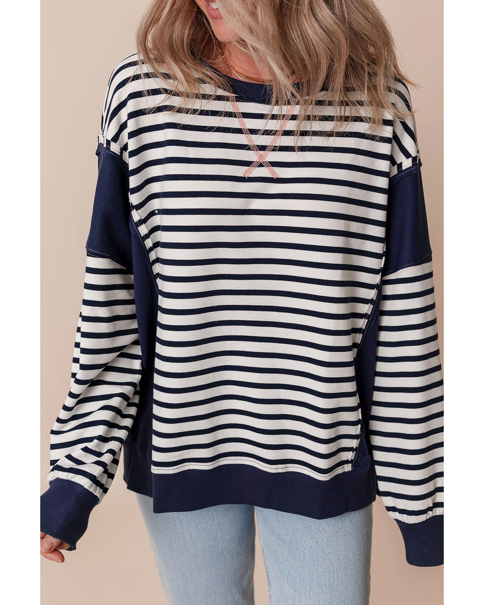 White Stripe Color Block Exposed Seam Loose Fit Sweatshirt – M