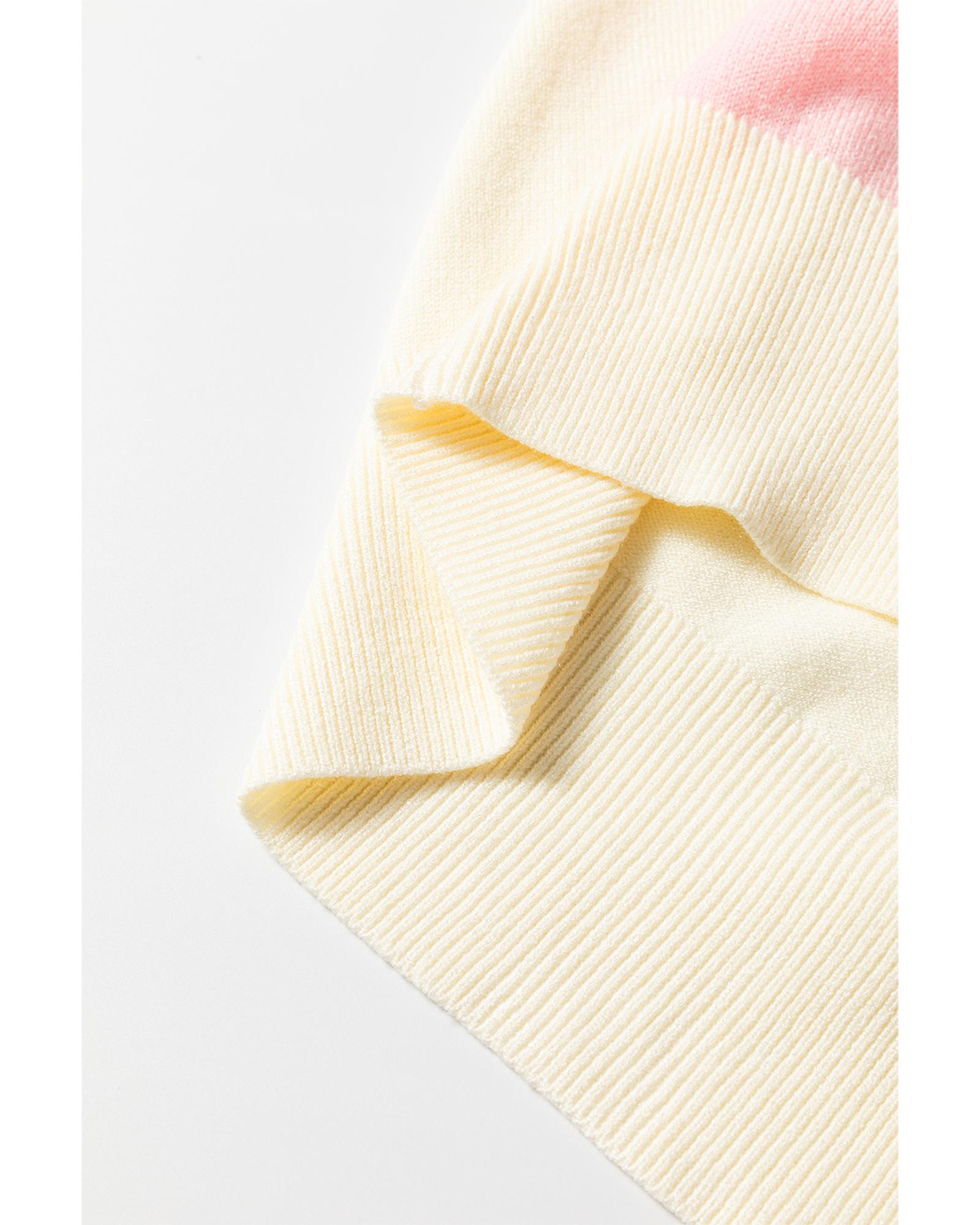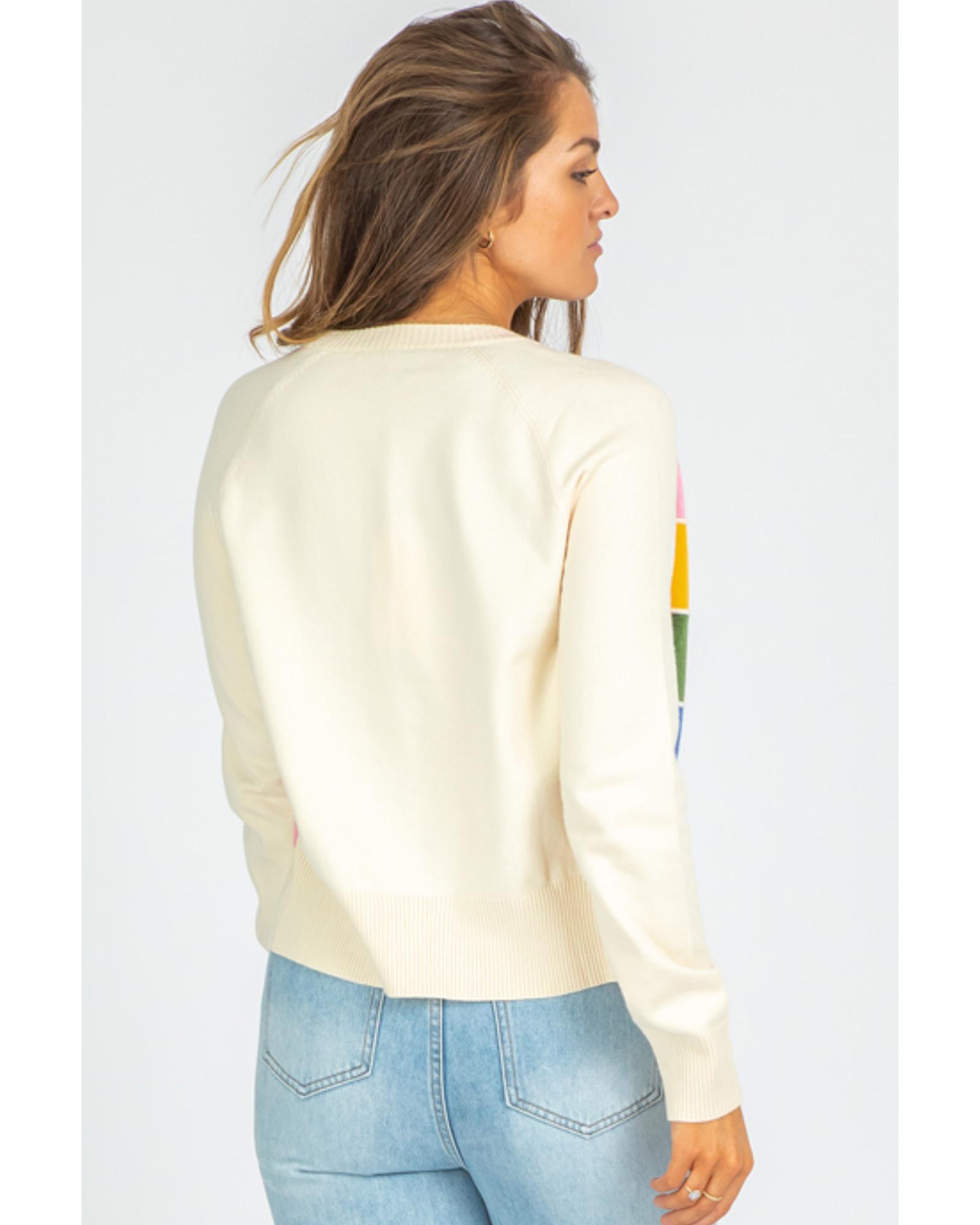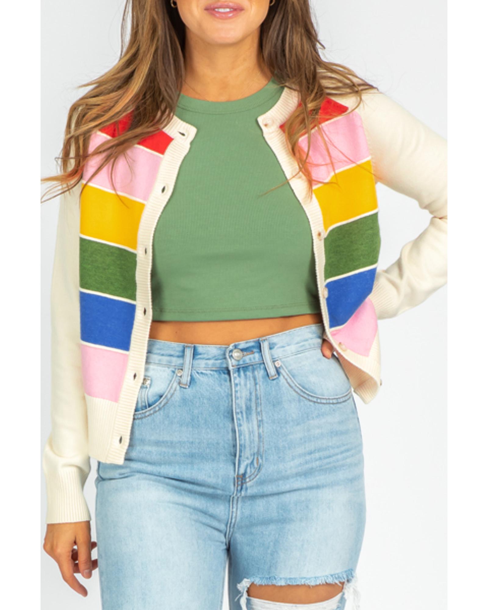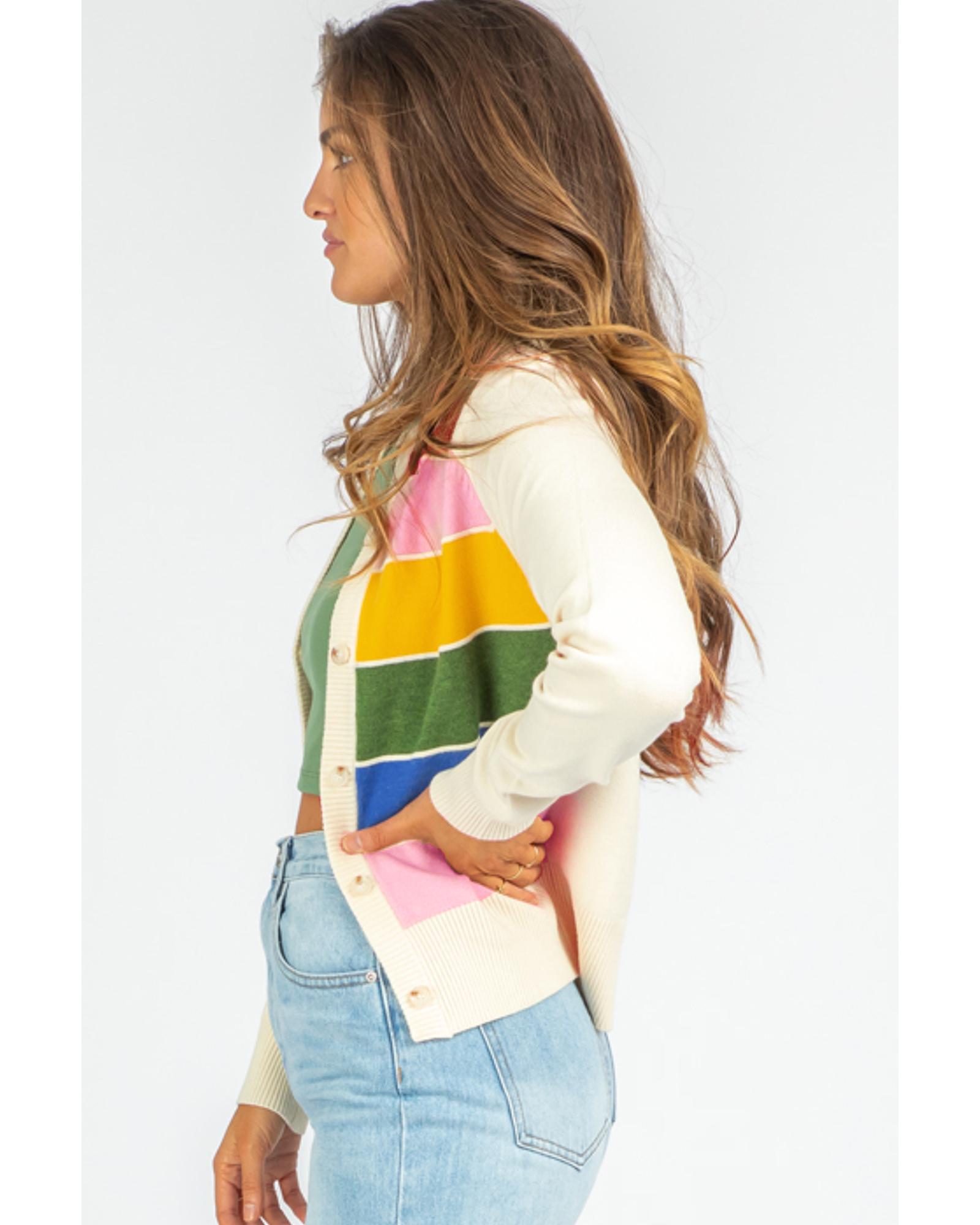 White Stripe Colorful Pattern Button Front Sweater Cardigan – M