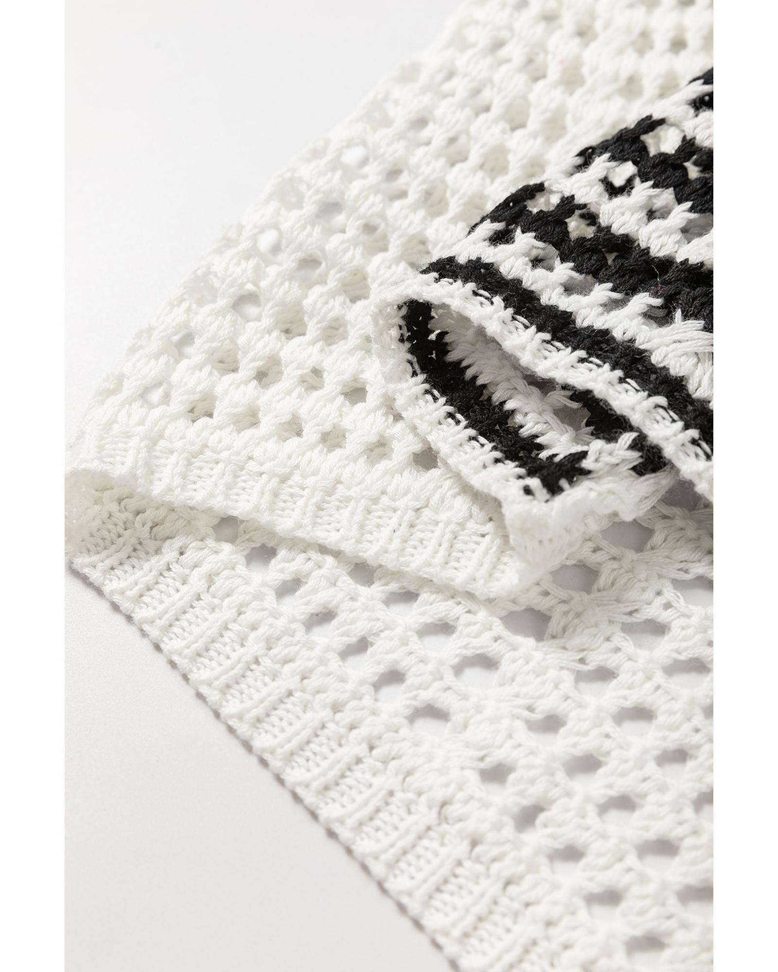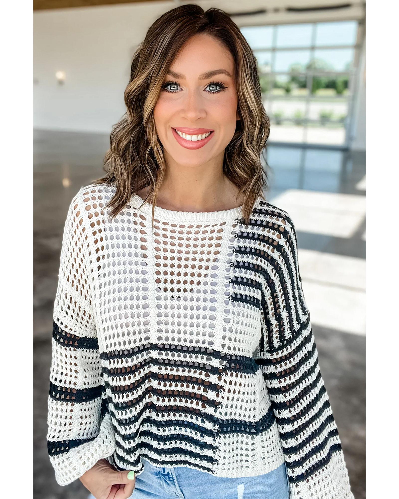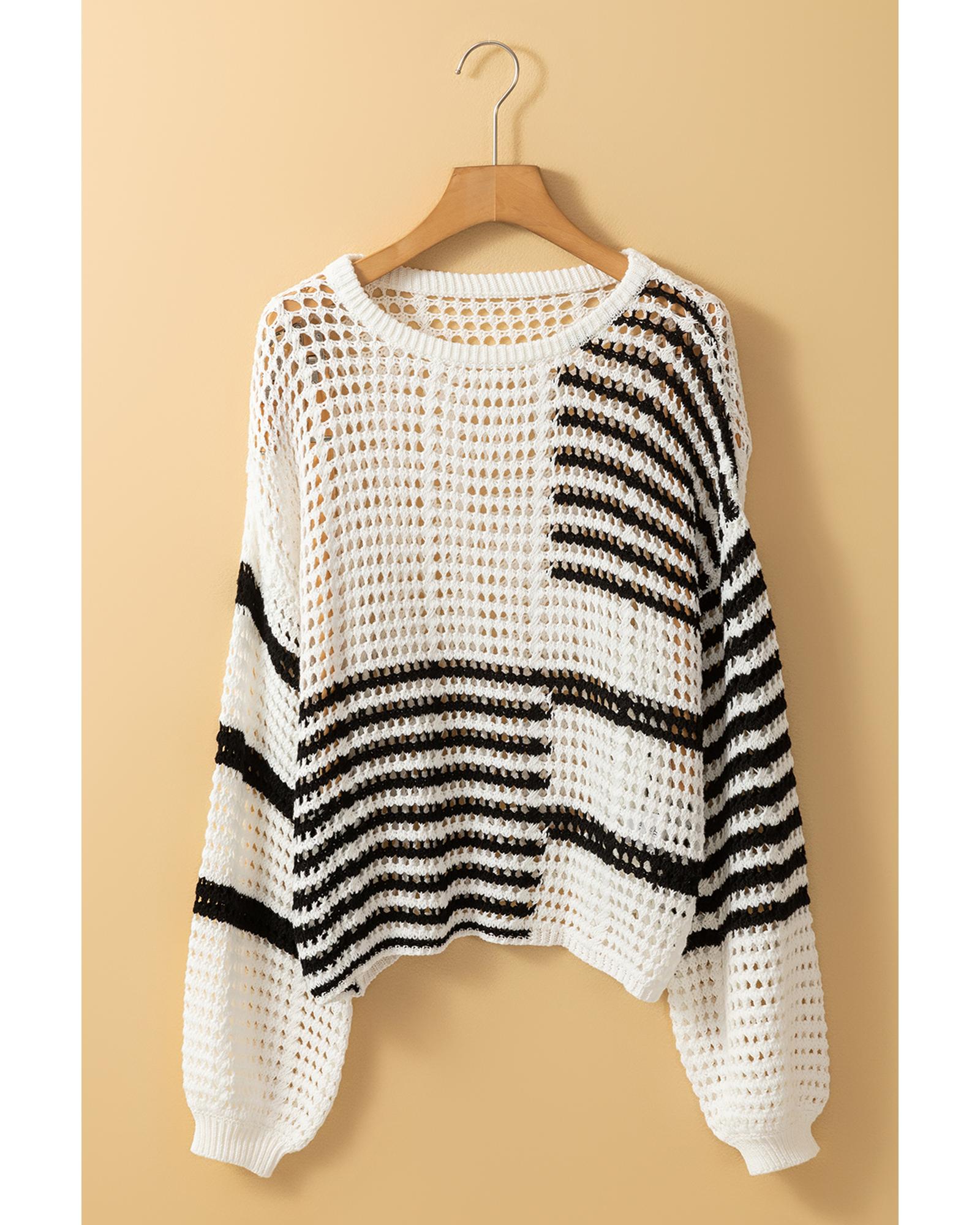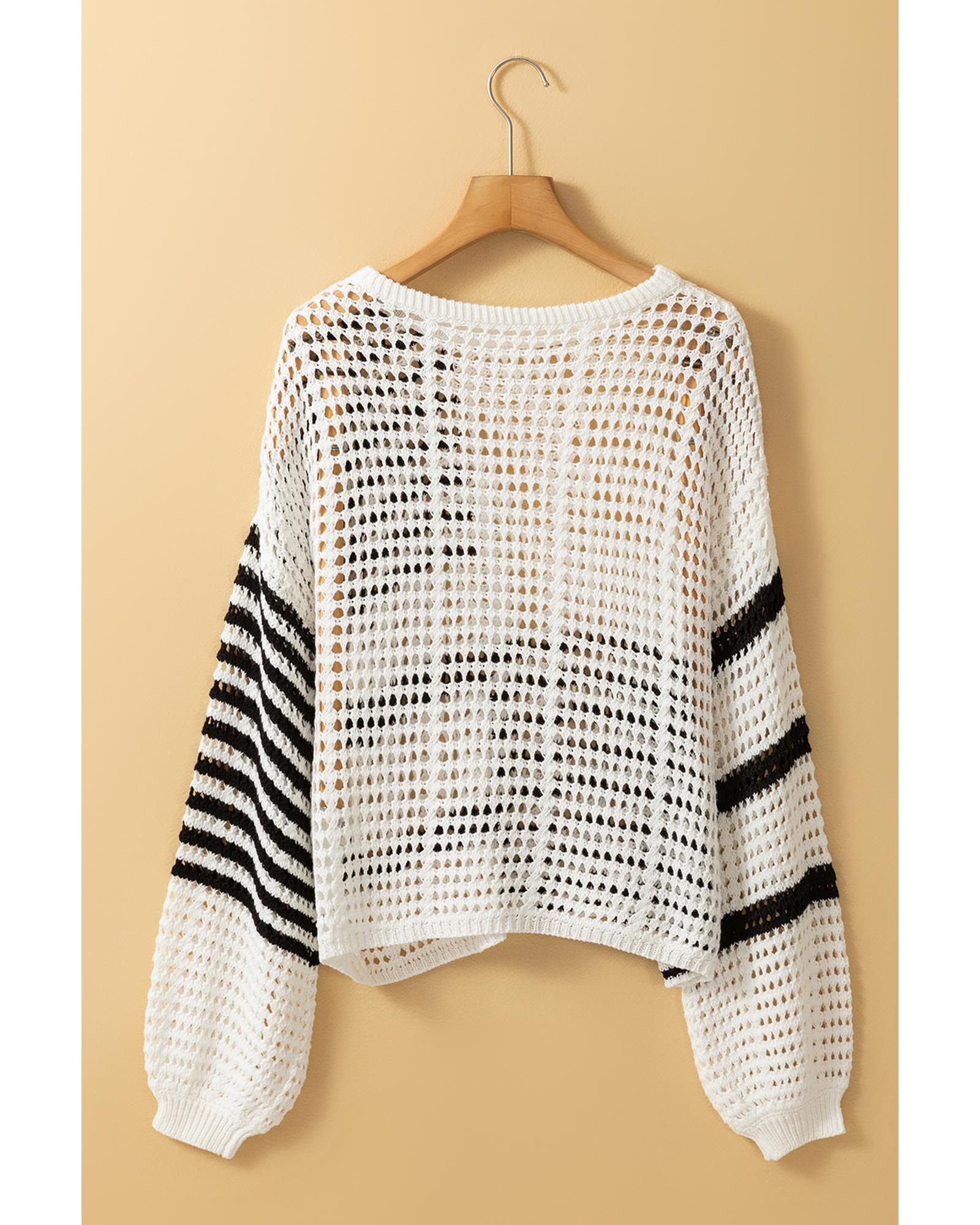 White Stripe Contrast Striped Crochet Puff Sleeve Sweater – M