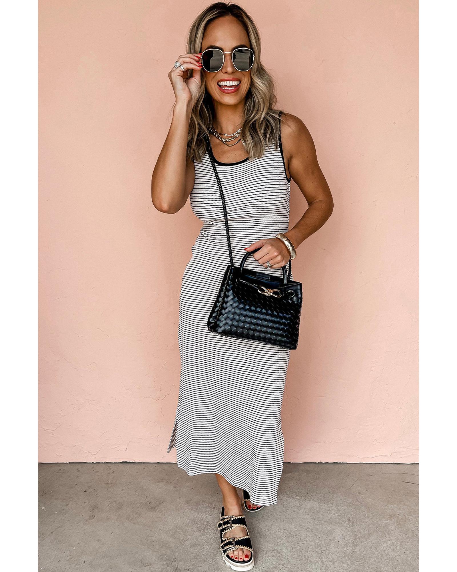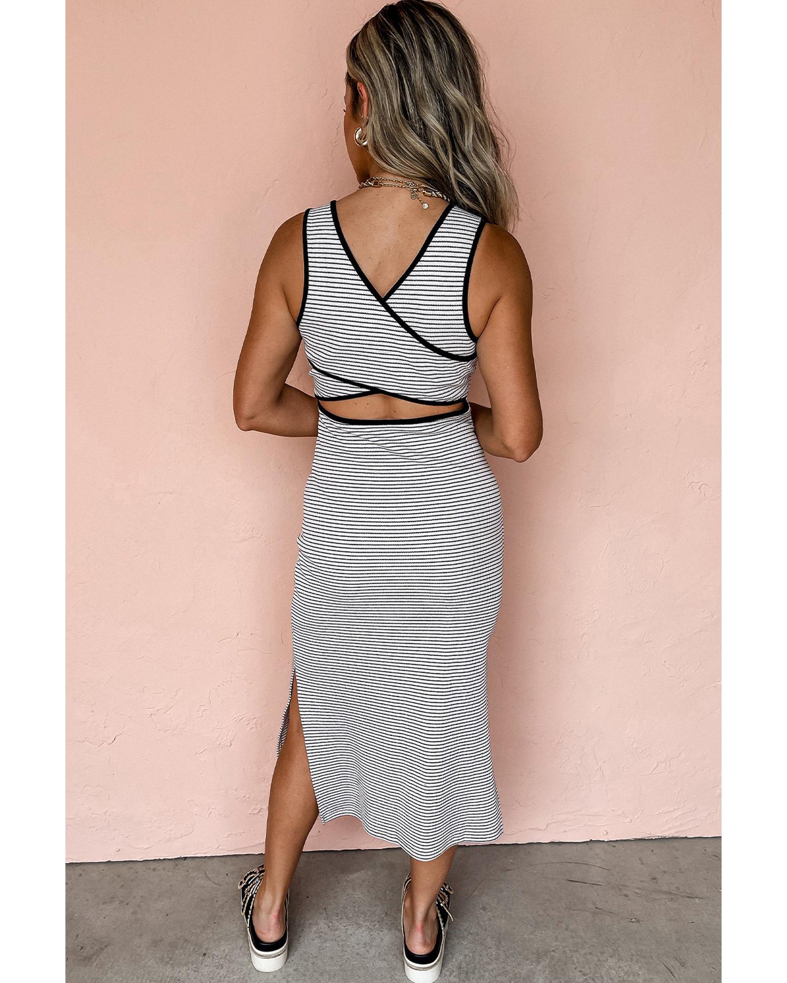 - White Stripe Criss Cross Side Slits Slim Fit Sleeveless Midi Dress