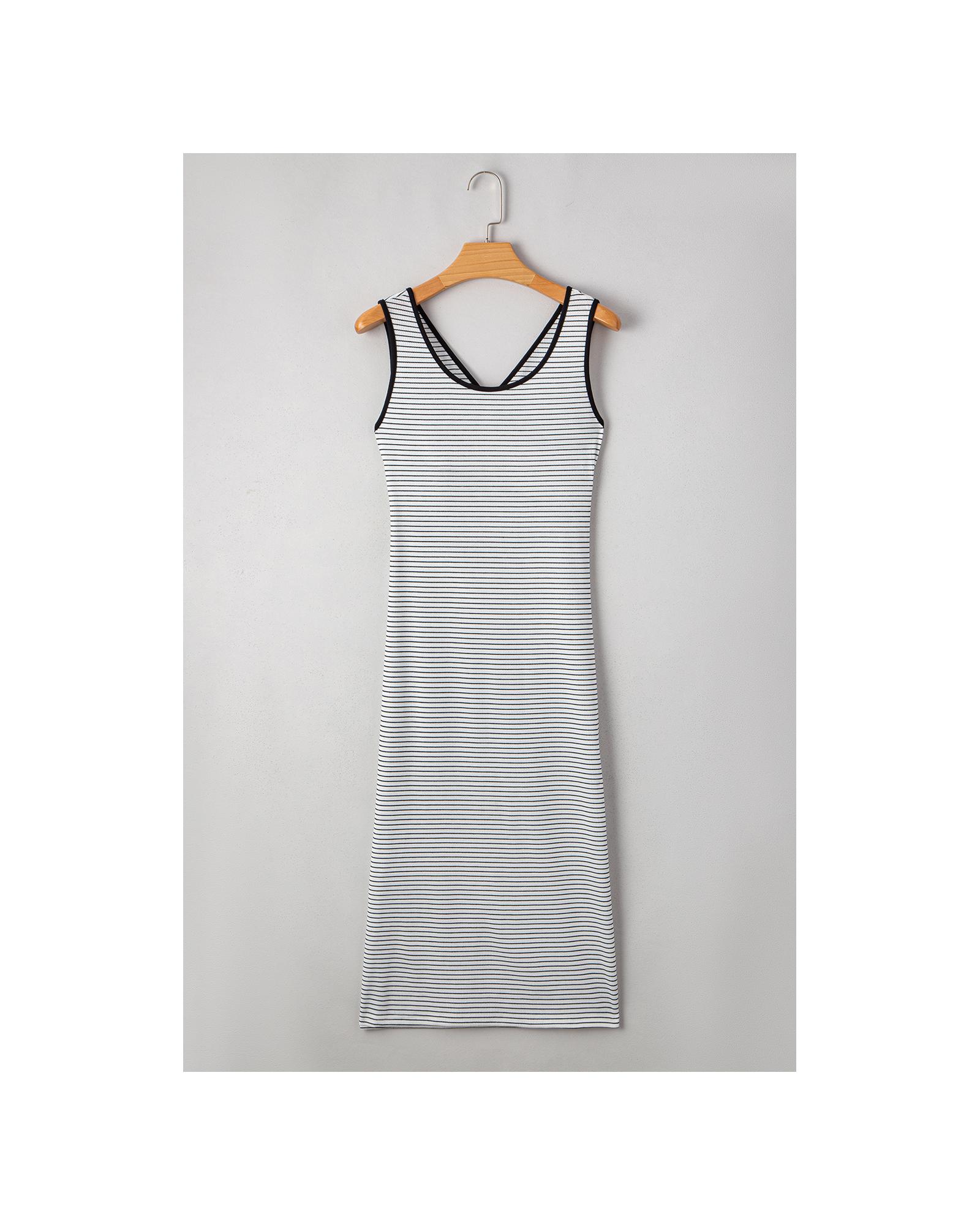 - White Stripe Criss Cross Side Slits Slim Fit Sleeveless Midi Dress
