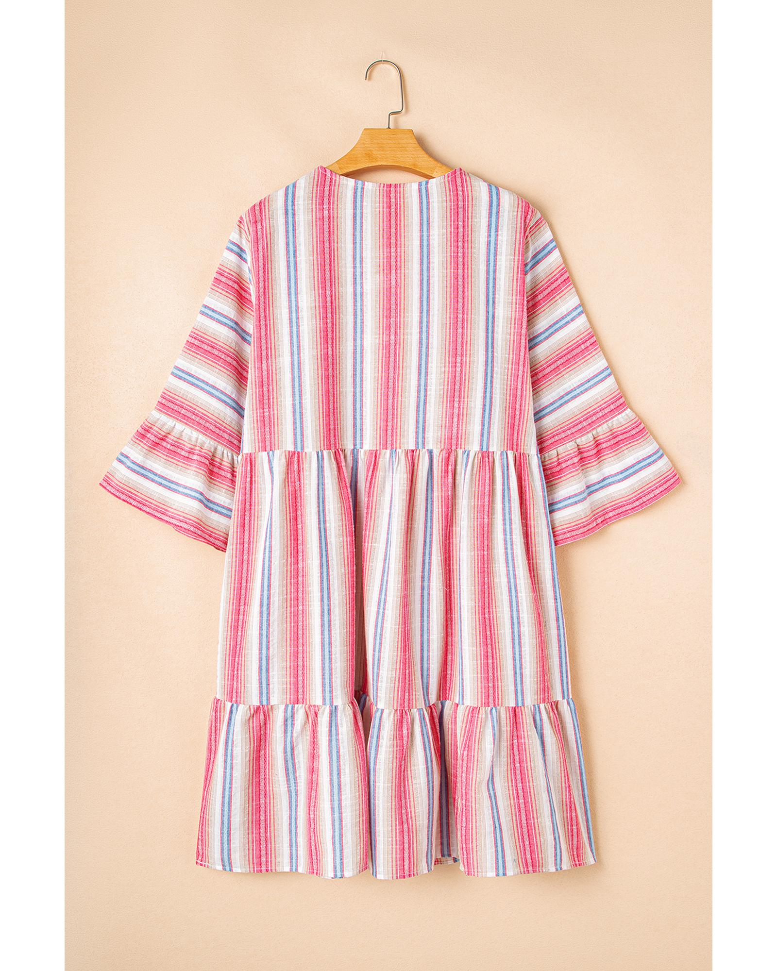 White Stripe Plus Size Embroidered Detail Flared 3/4 Sleeve V Neck Dress – 1X