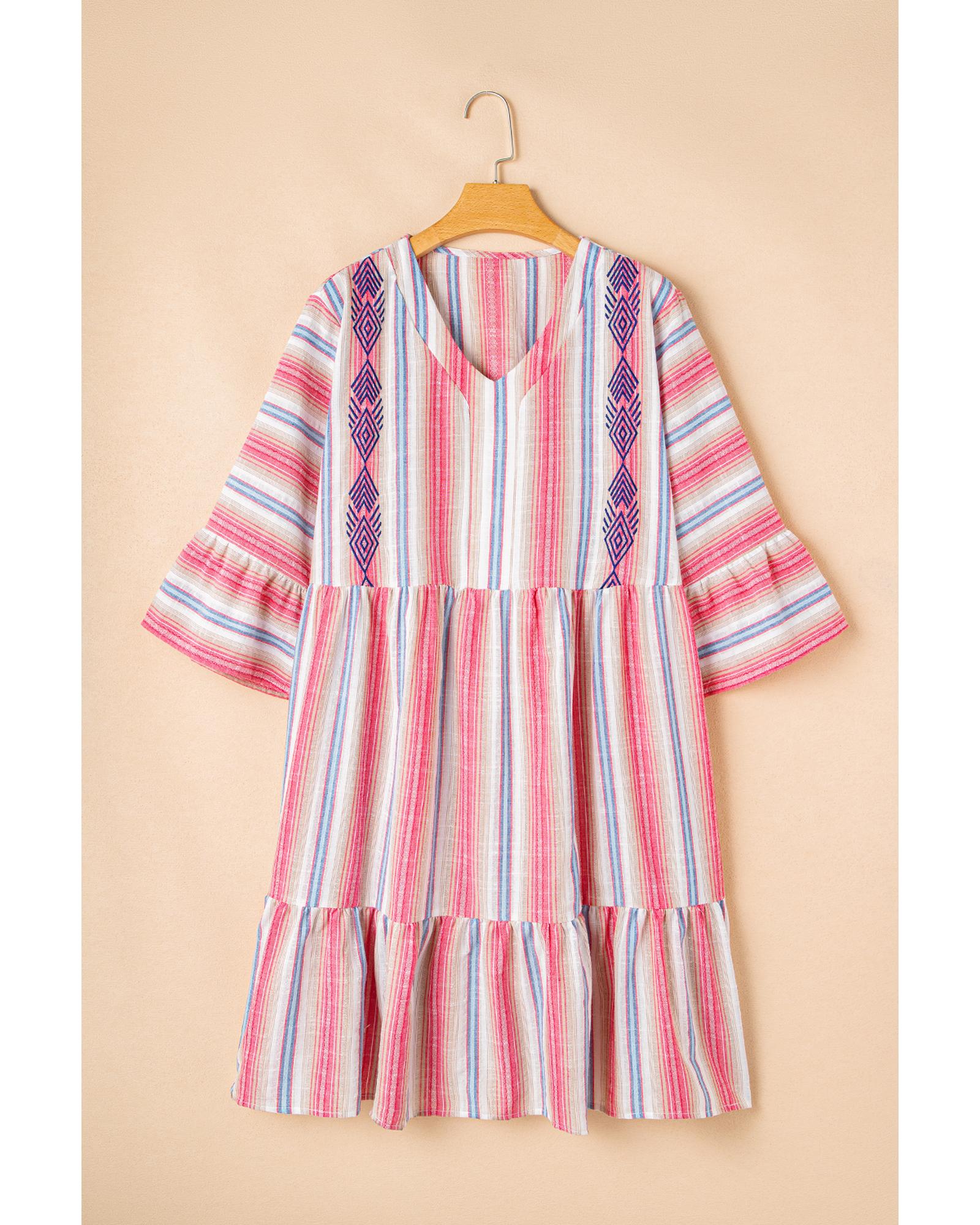 White Stripe Plus Size Embroidered Detail Flared 3/4 Sleeve V Neck Dress – 3X