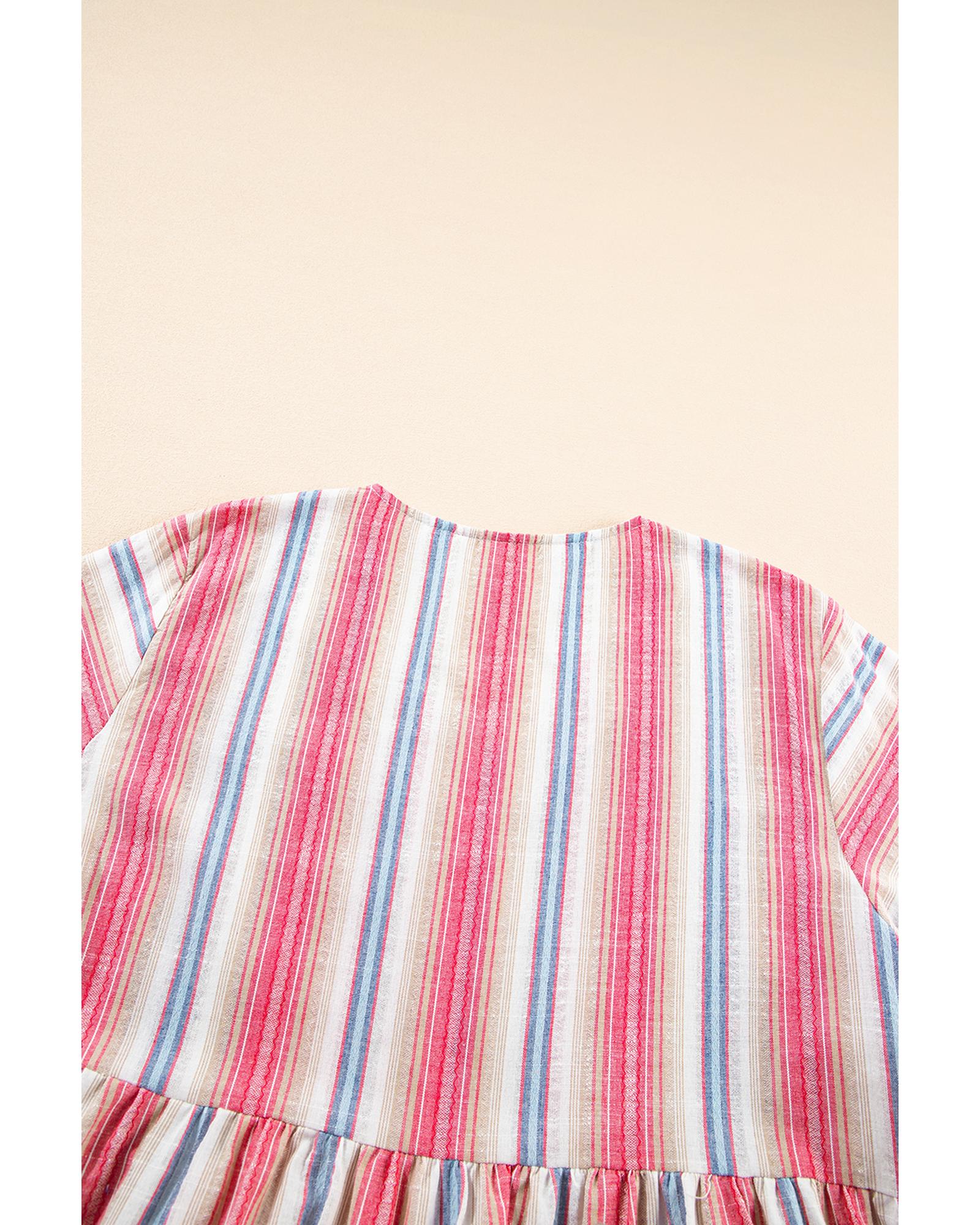 - White Stripe Plus Size Embroidered Detail Flared 3/4 Sleeve V Neck Dress