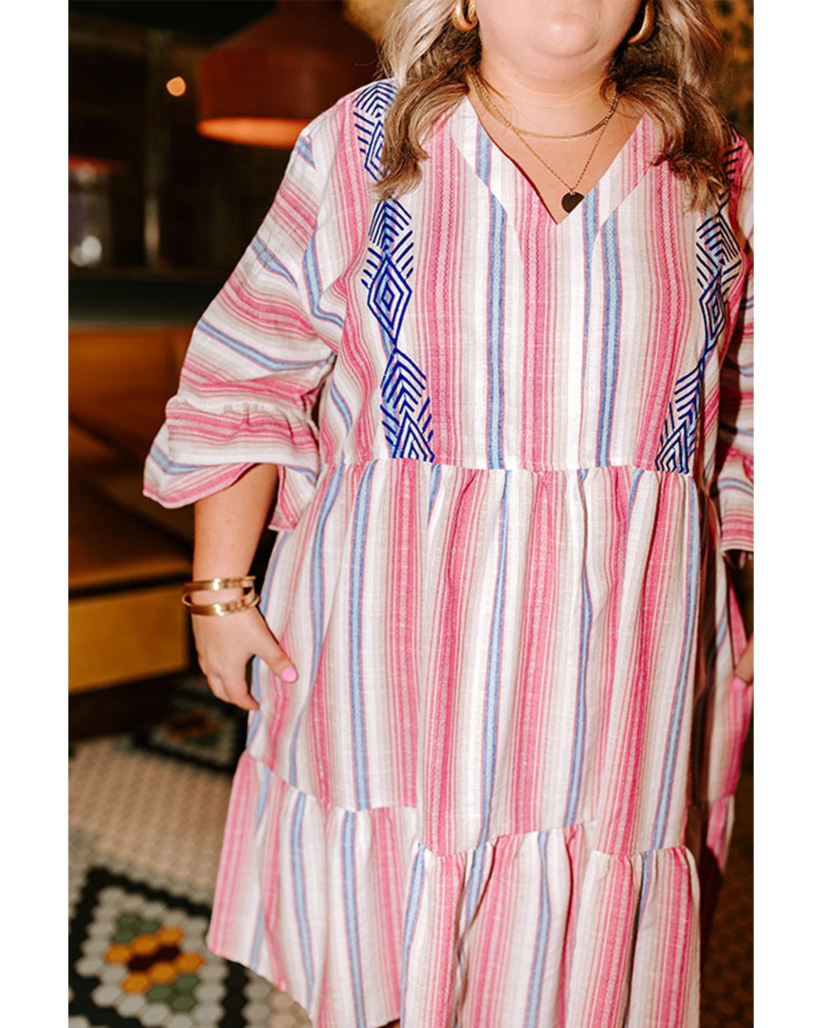 - White Stripe Plus Size Embroidered Detail Flared 3/4 Sleeve V Neck Dress