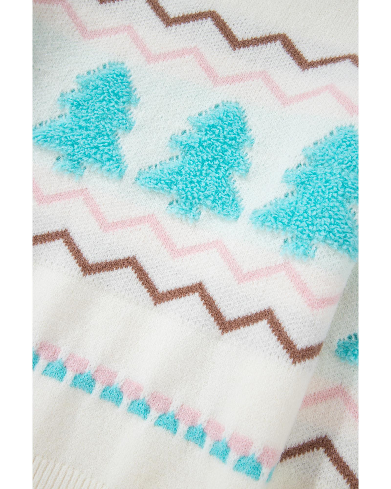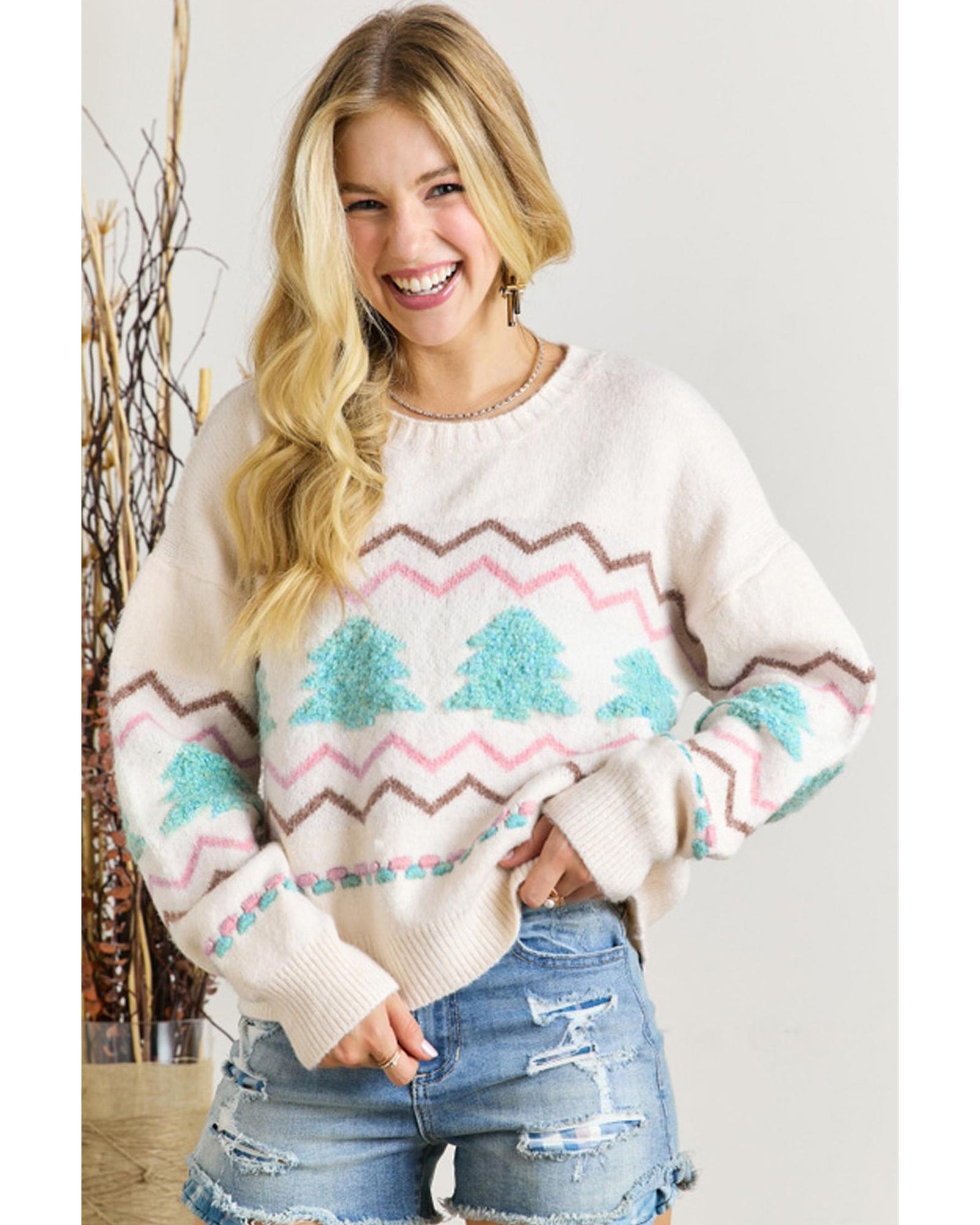 White Striped Christmas Tree Ribbed Trim Drop Shoulder Sweater – S