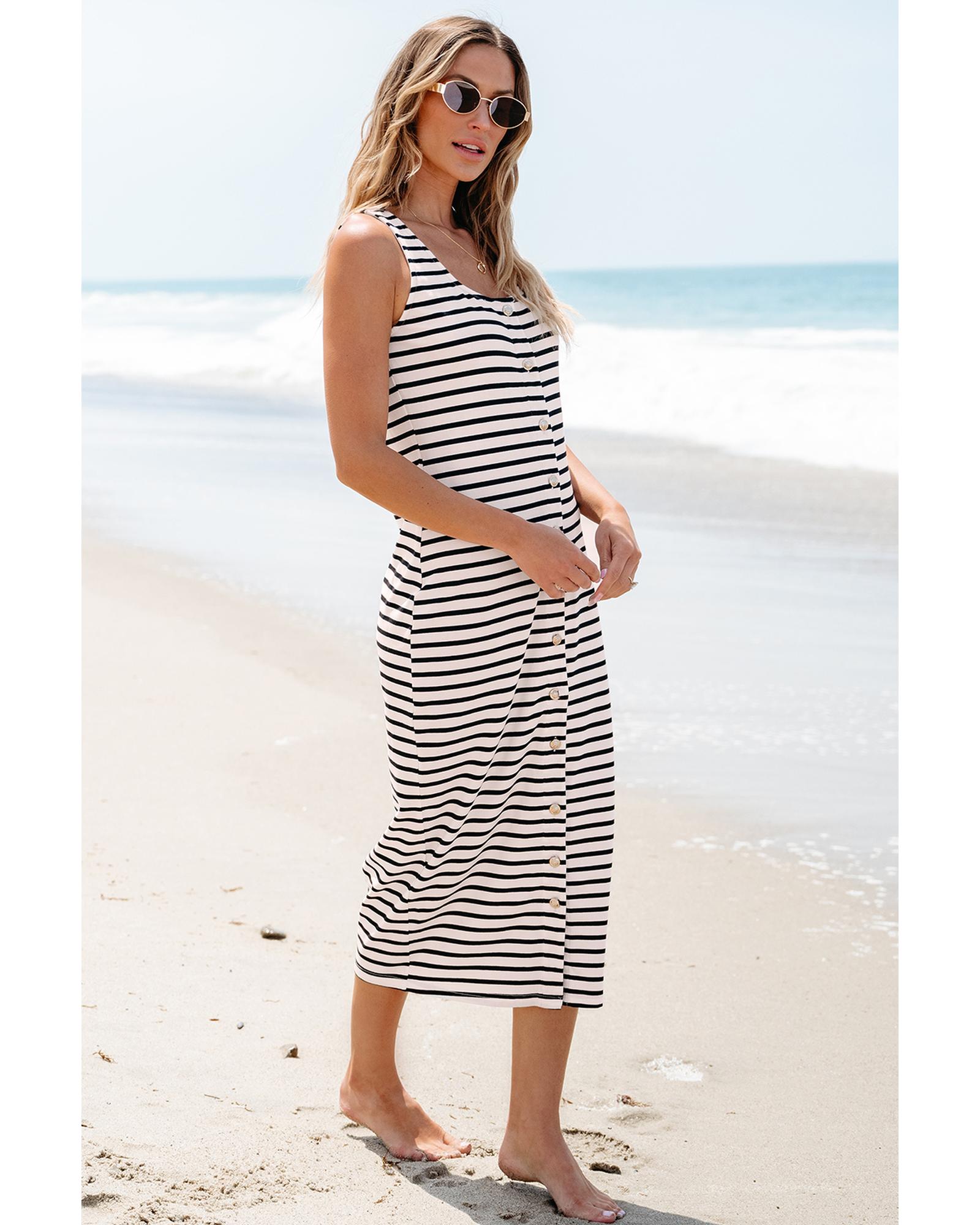 White Striped Print Sleeveless Buttoned Maxi Dress – S