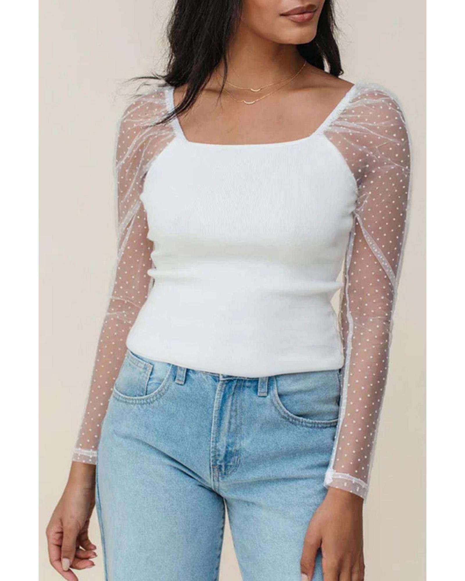 White Swiss Dot Mesh Long Sleeve Square Neck Slim Top – XL