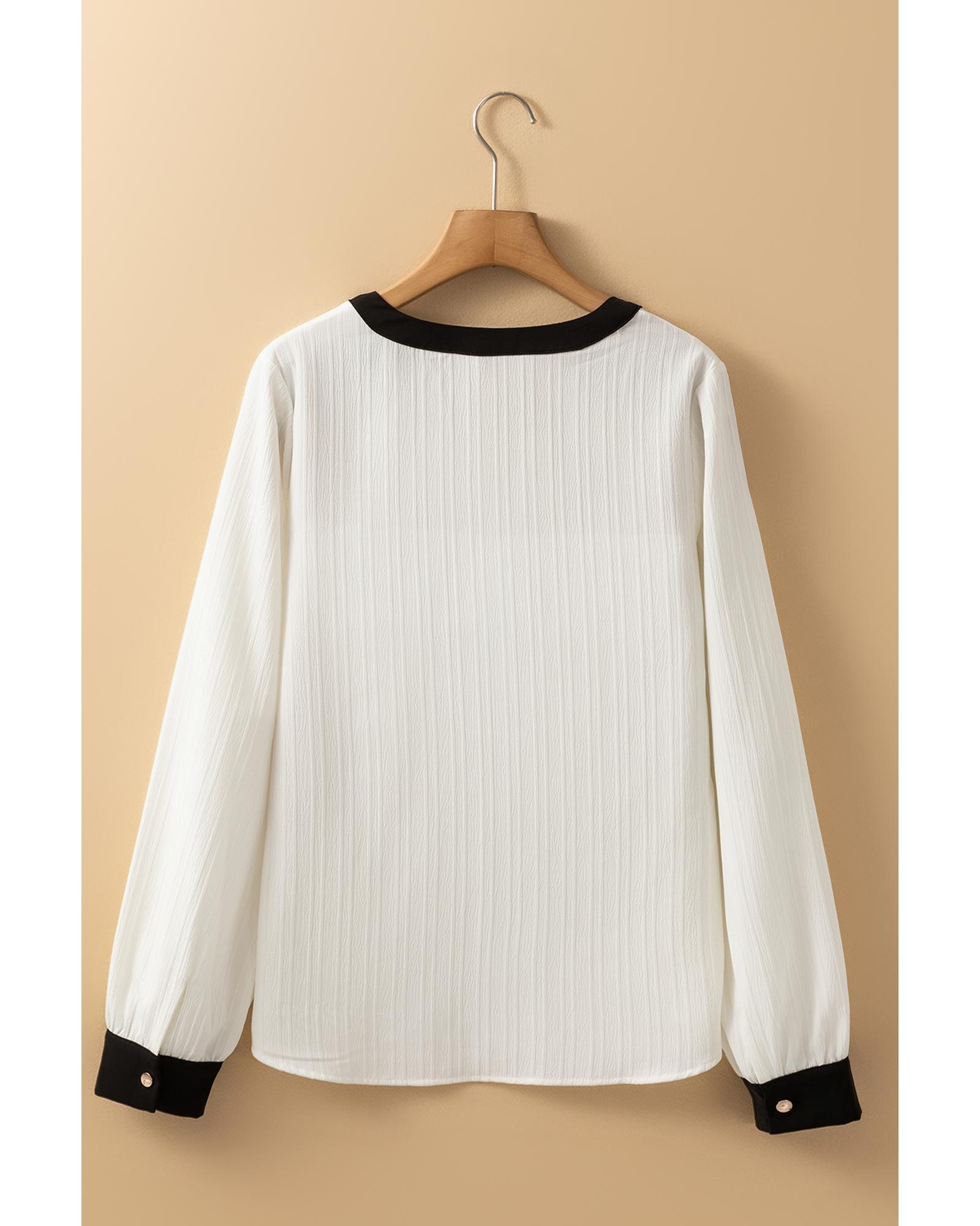 White Geometric Embroidered Long Sleeve Buttoned Blouse - XL