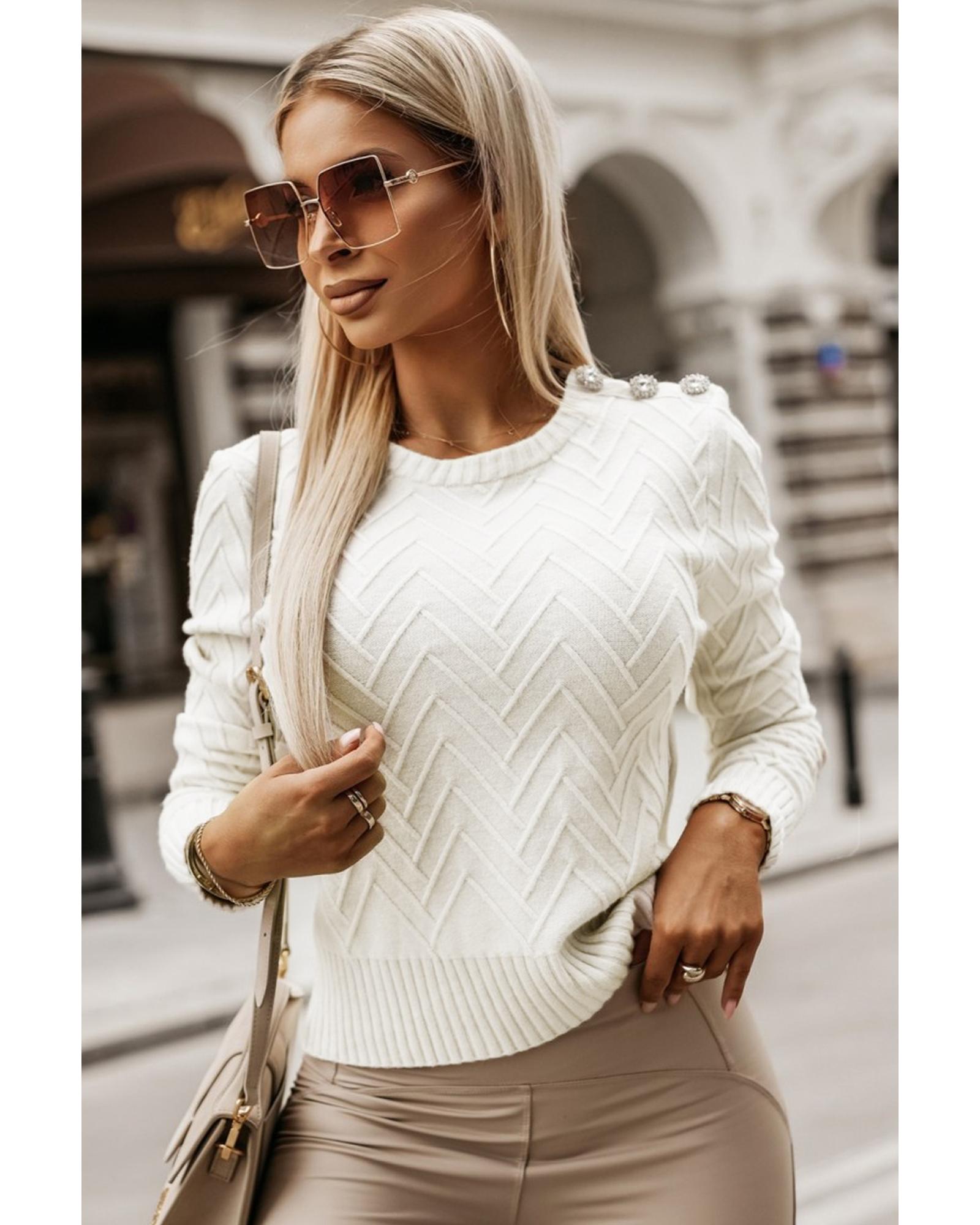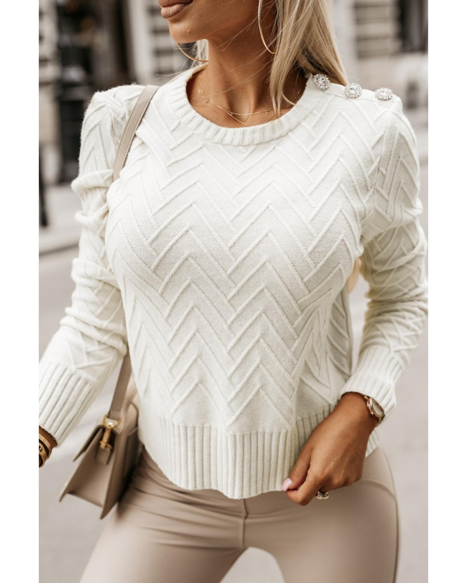 White Hollowed Detail Knitted Loose V Neck Sweater - S