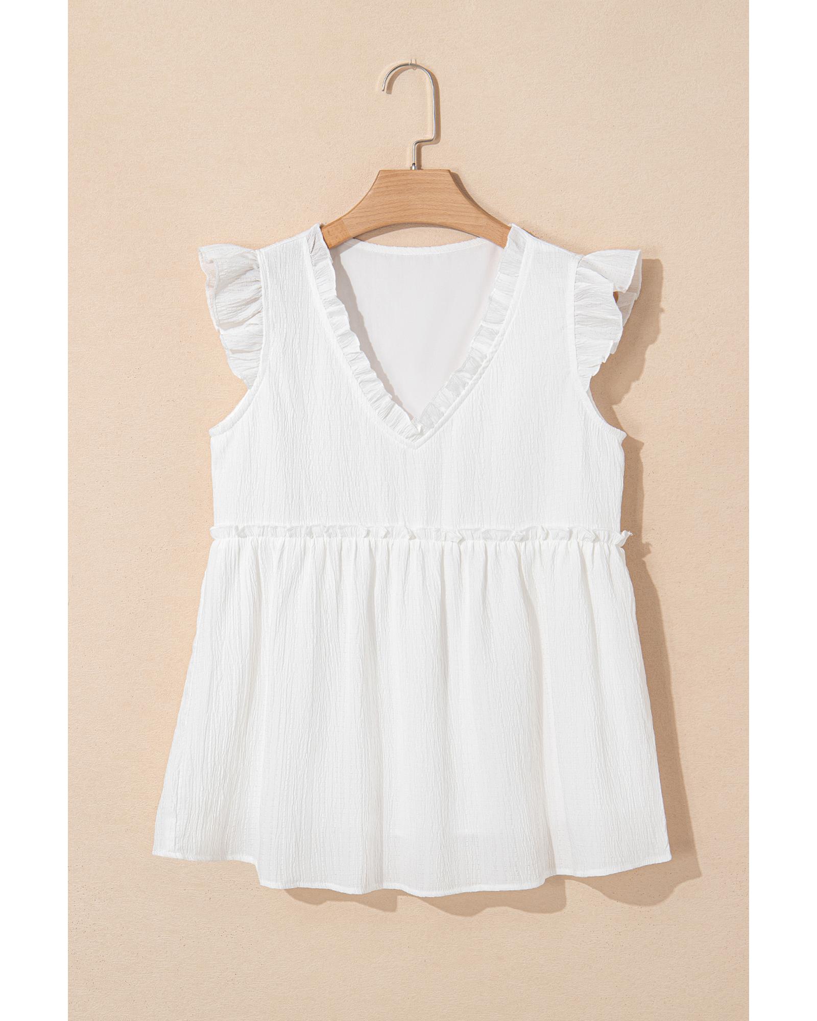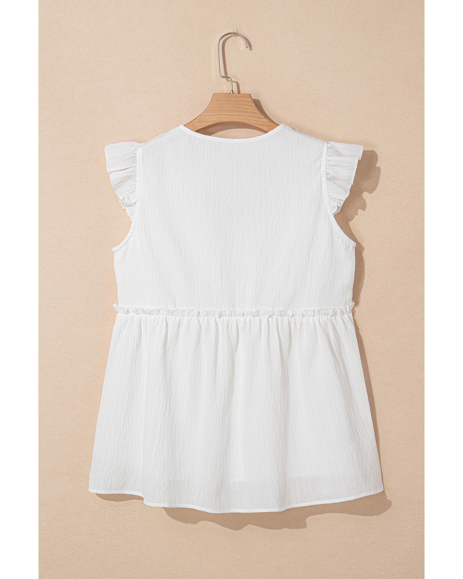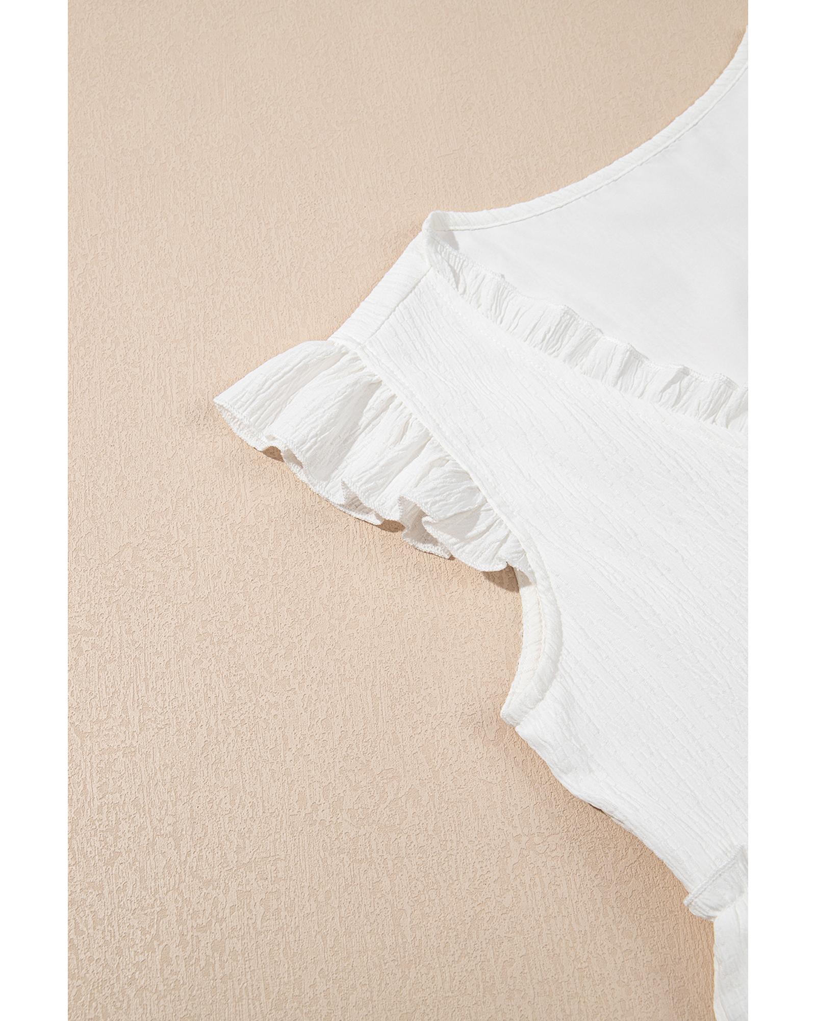 White Textured Ruffled Trim V Neck Flutter Flowy Top – L