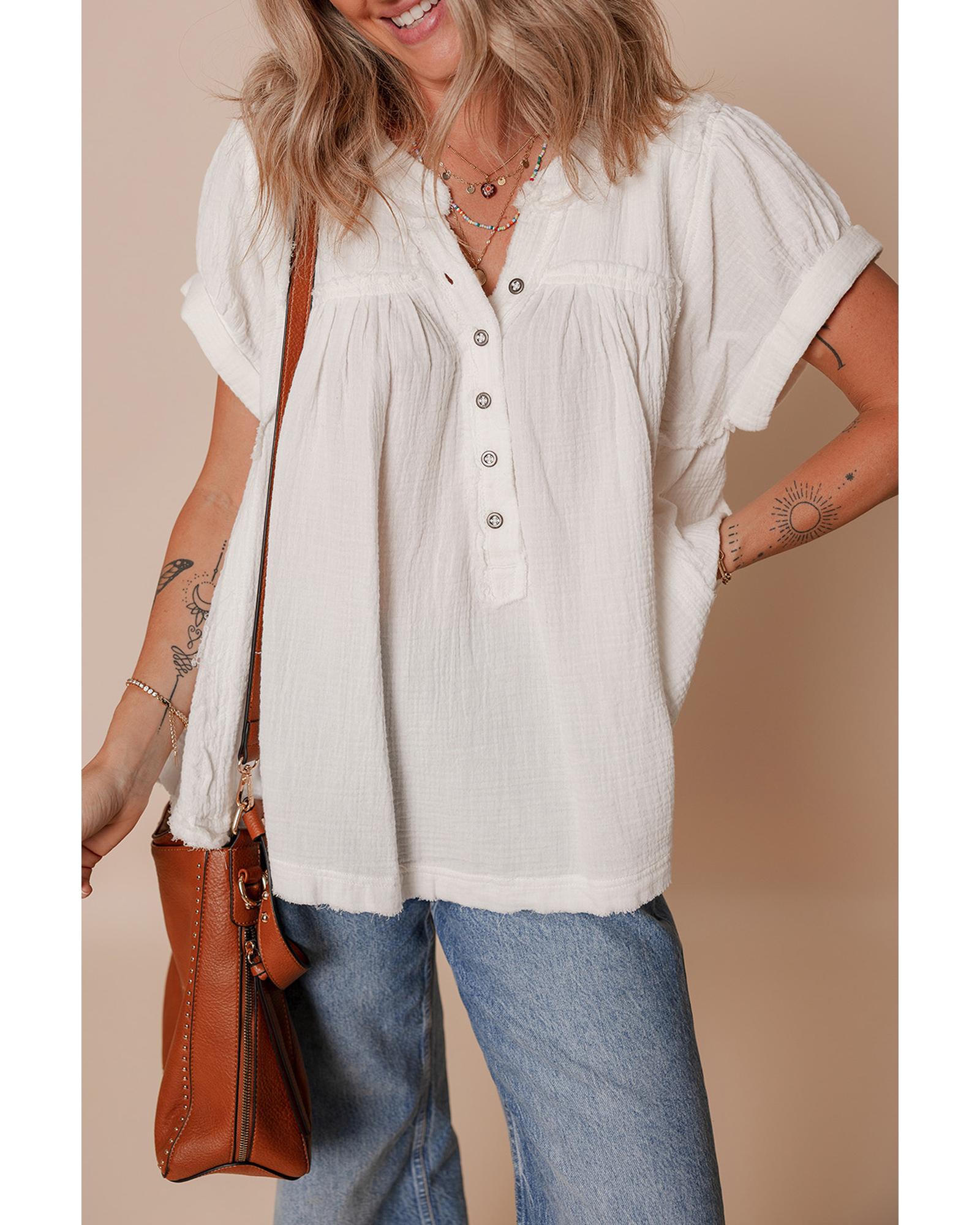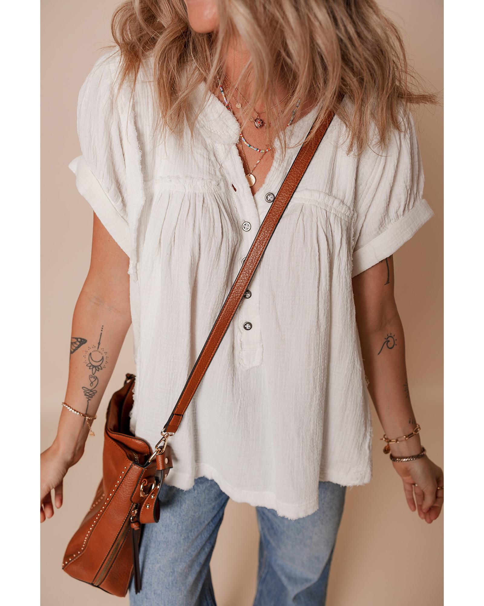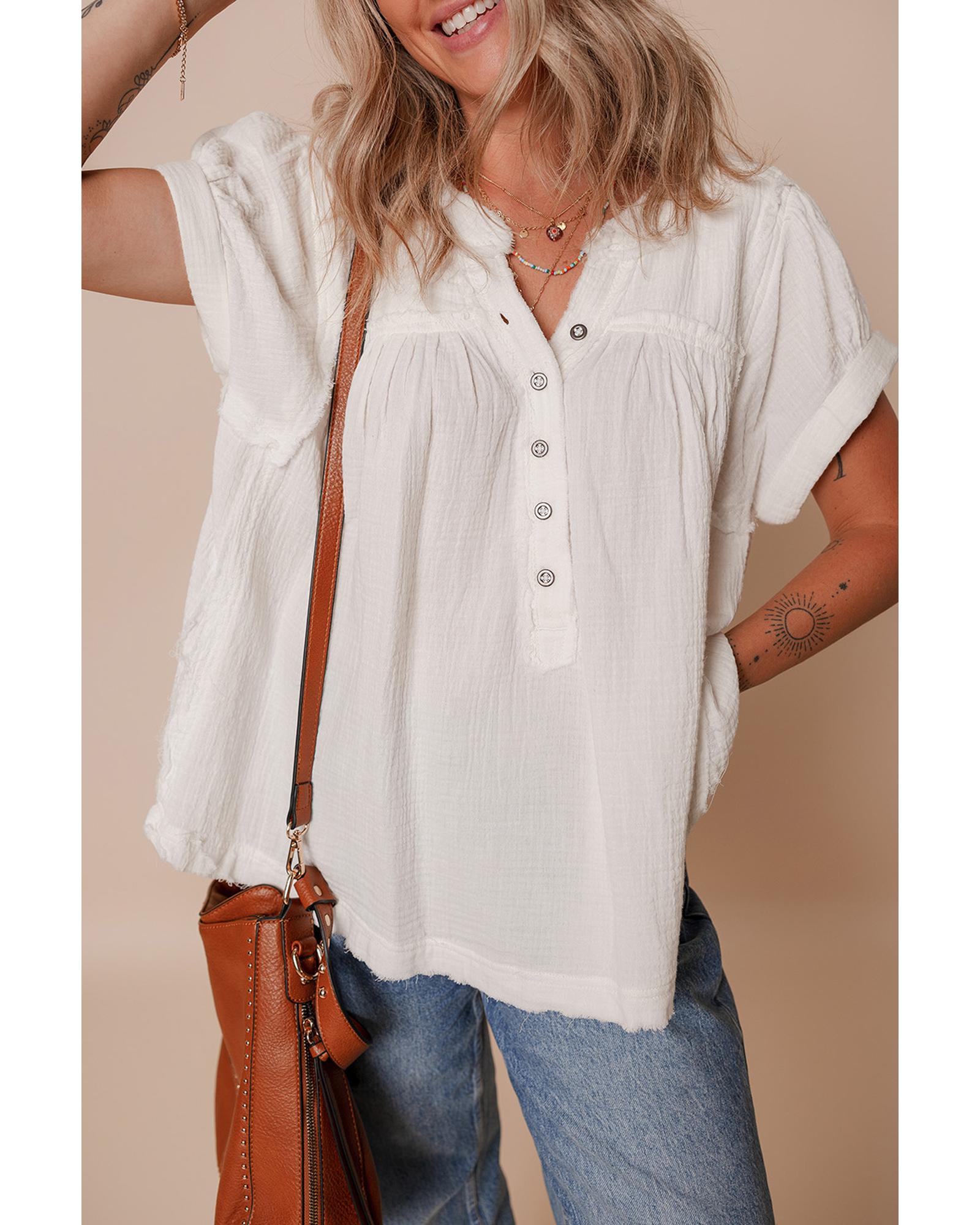 White Textured Short Sleeve Buttons Frayed Blouse – L
