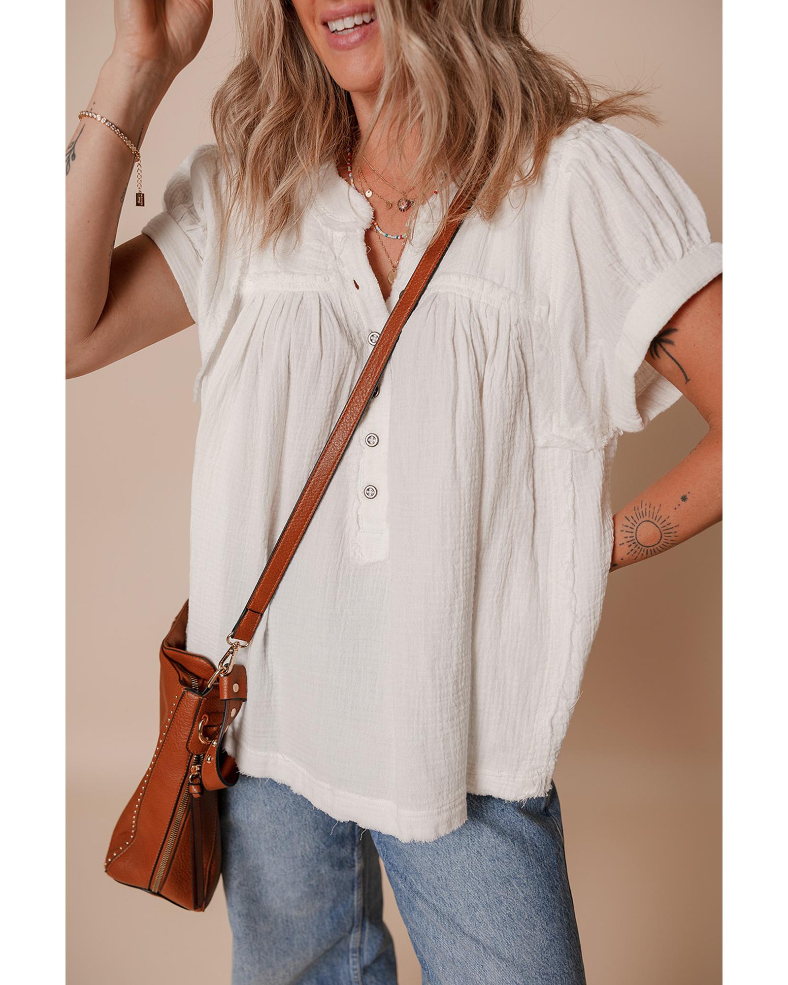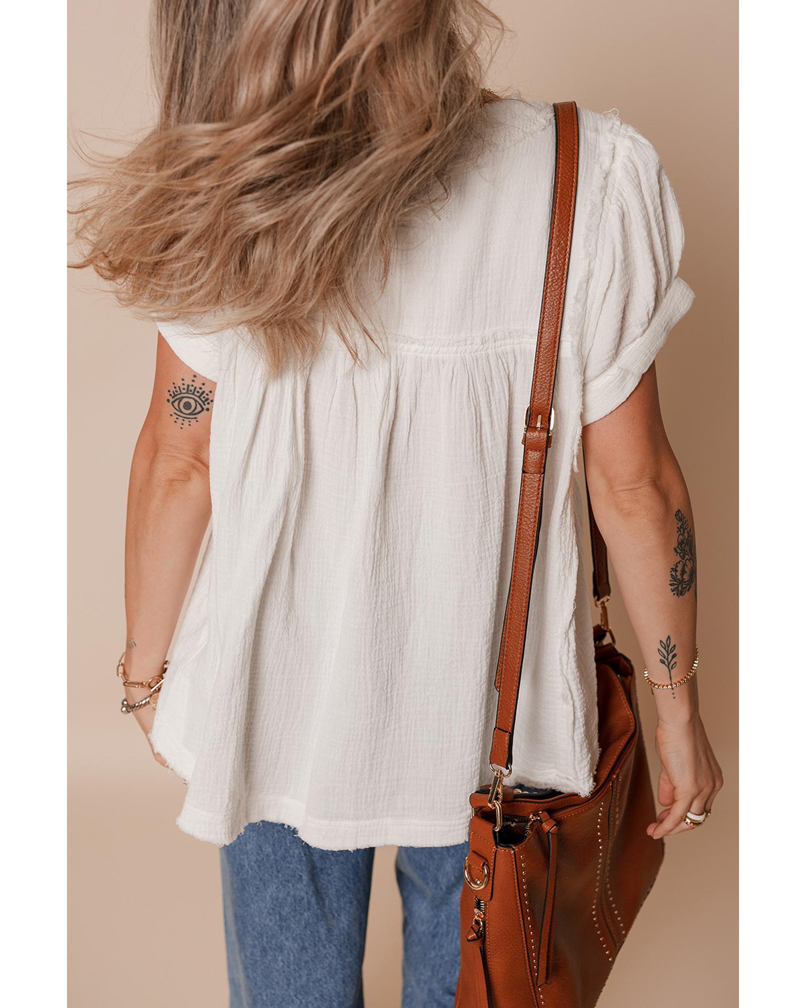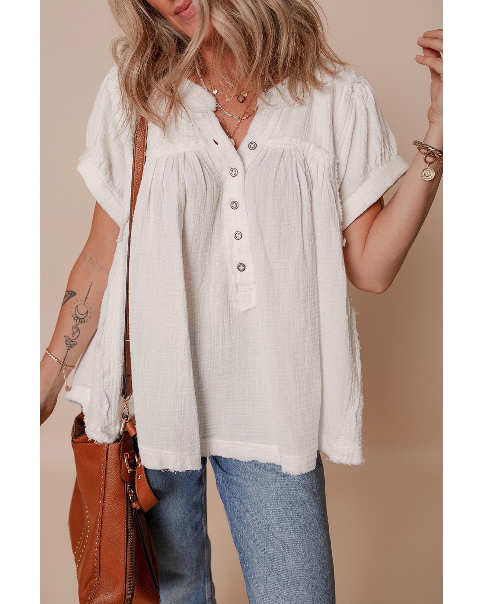 White Textured Short Sleeve Buttons Frayed Blouse – XL