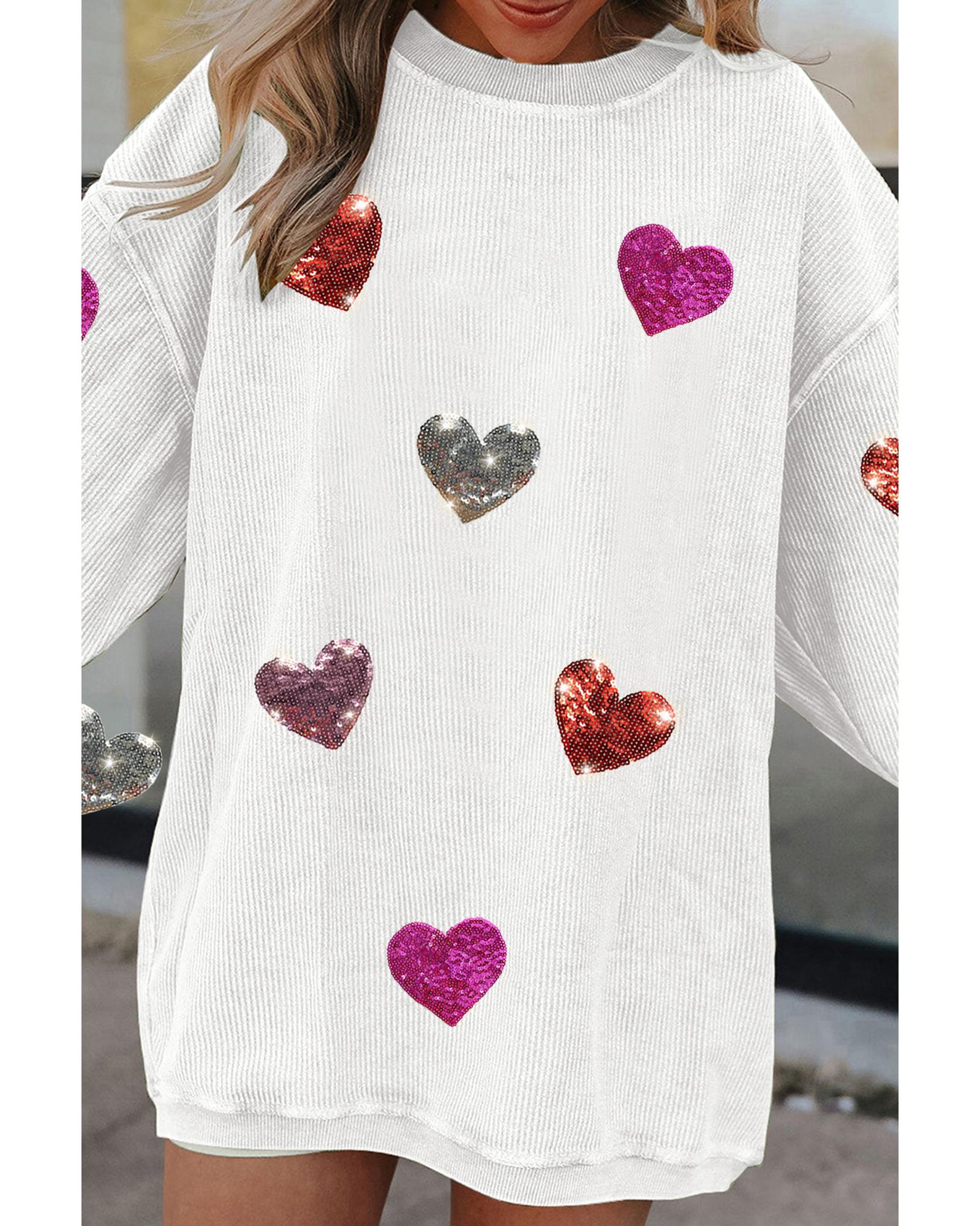 White Valentines Heart Patched Pattern Corded Pullover Sweatshirt – L