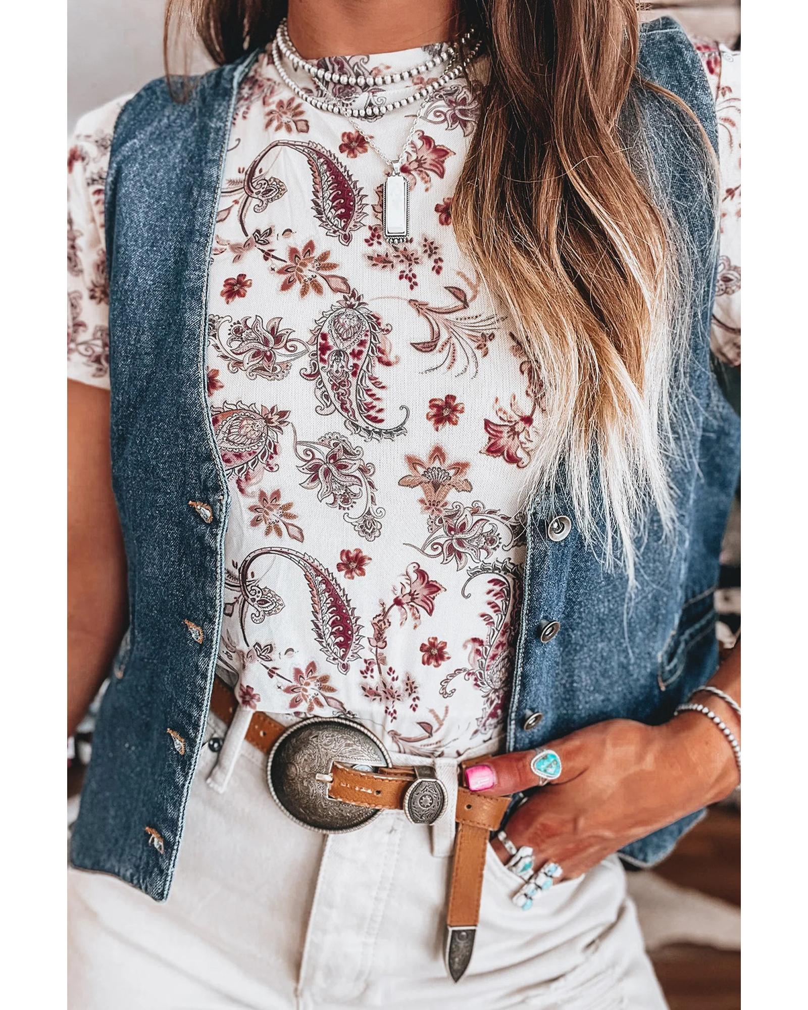 Multicolour Abstract Print Lace Detail Shirred Short Sleeve Split Neck Blouse - L