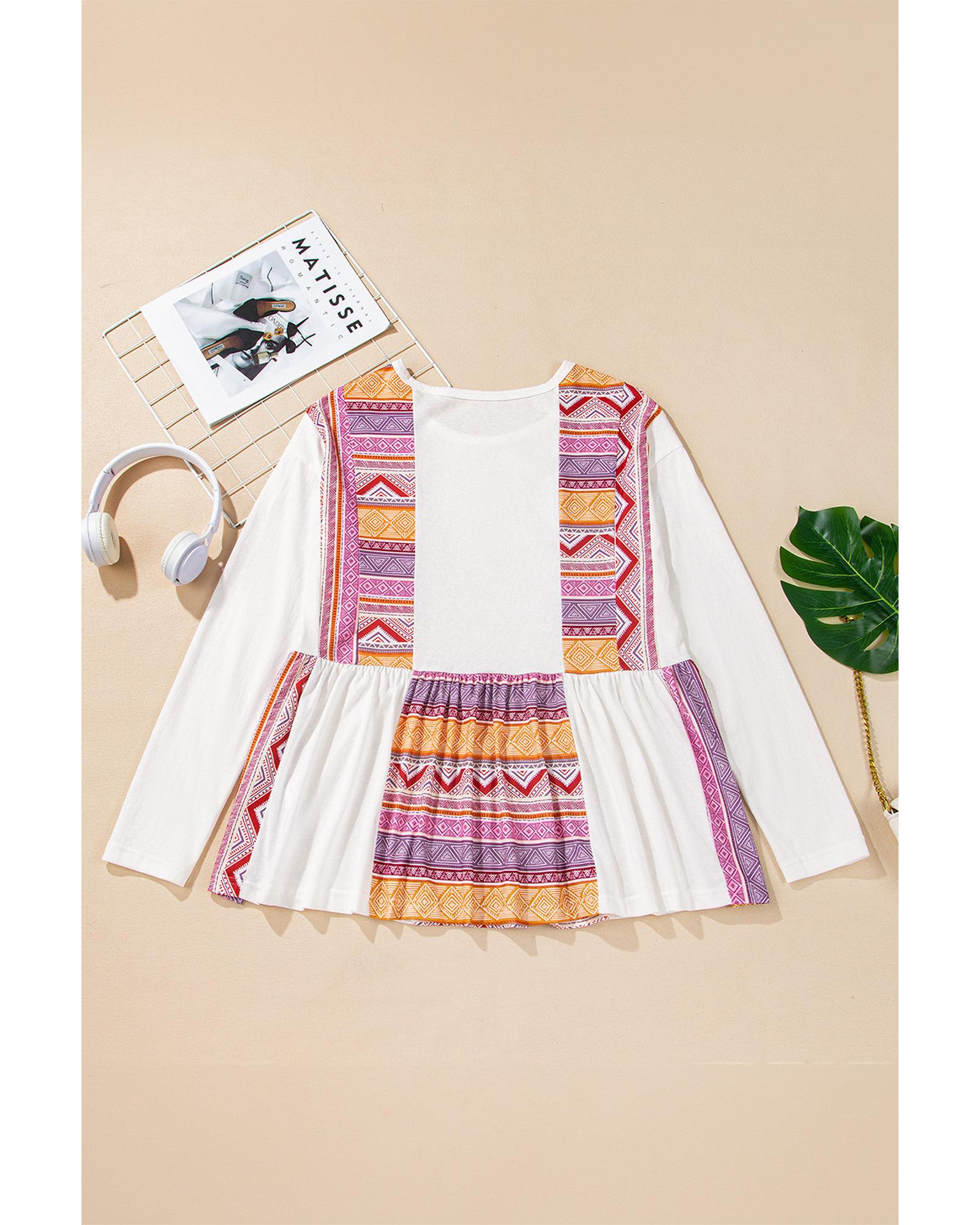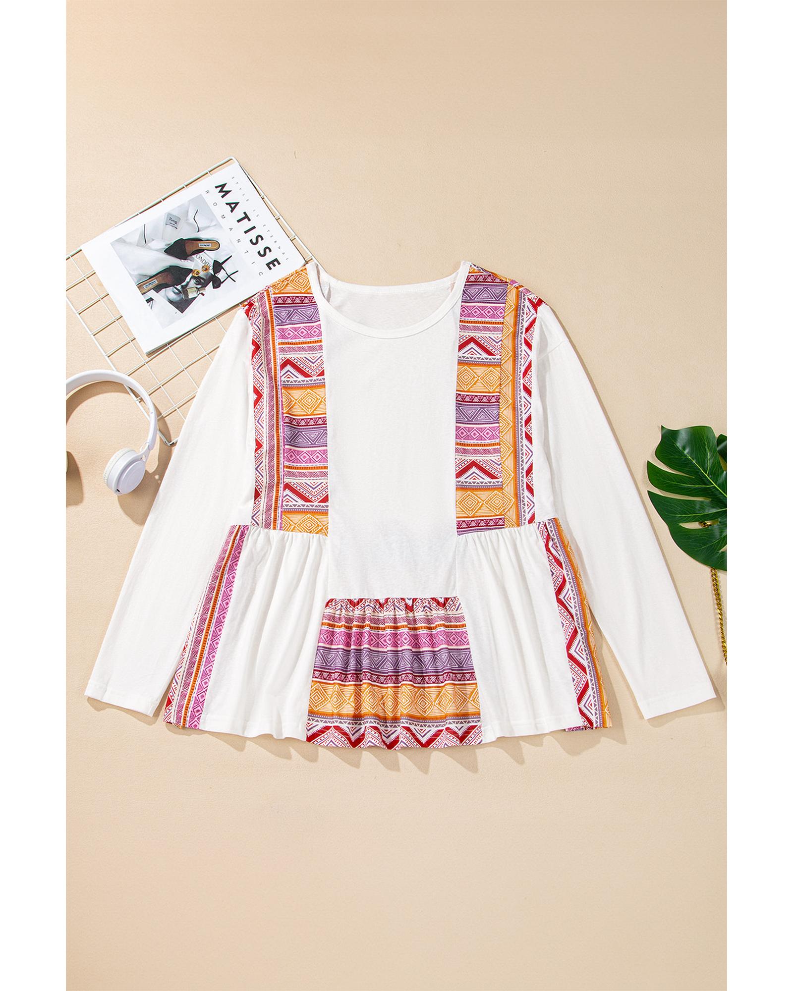 White Western Aztec Print Patchwork Ruffled Tunic Long Sleeve Babydoll Top – M