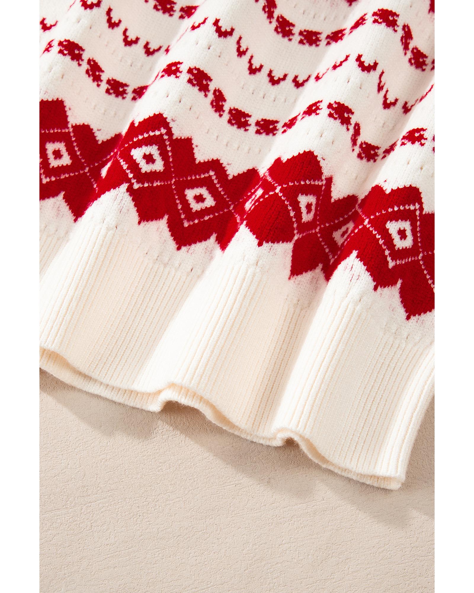 White Western Geometric Patterned Crew Neck Loose Sweater – L