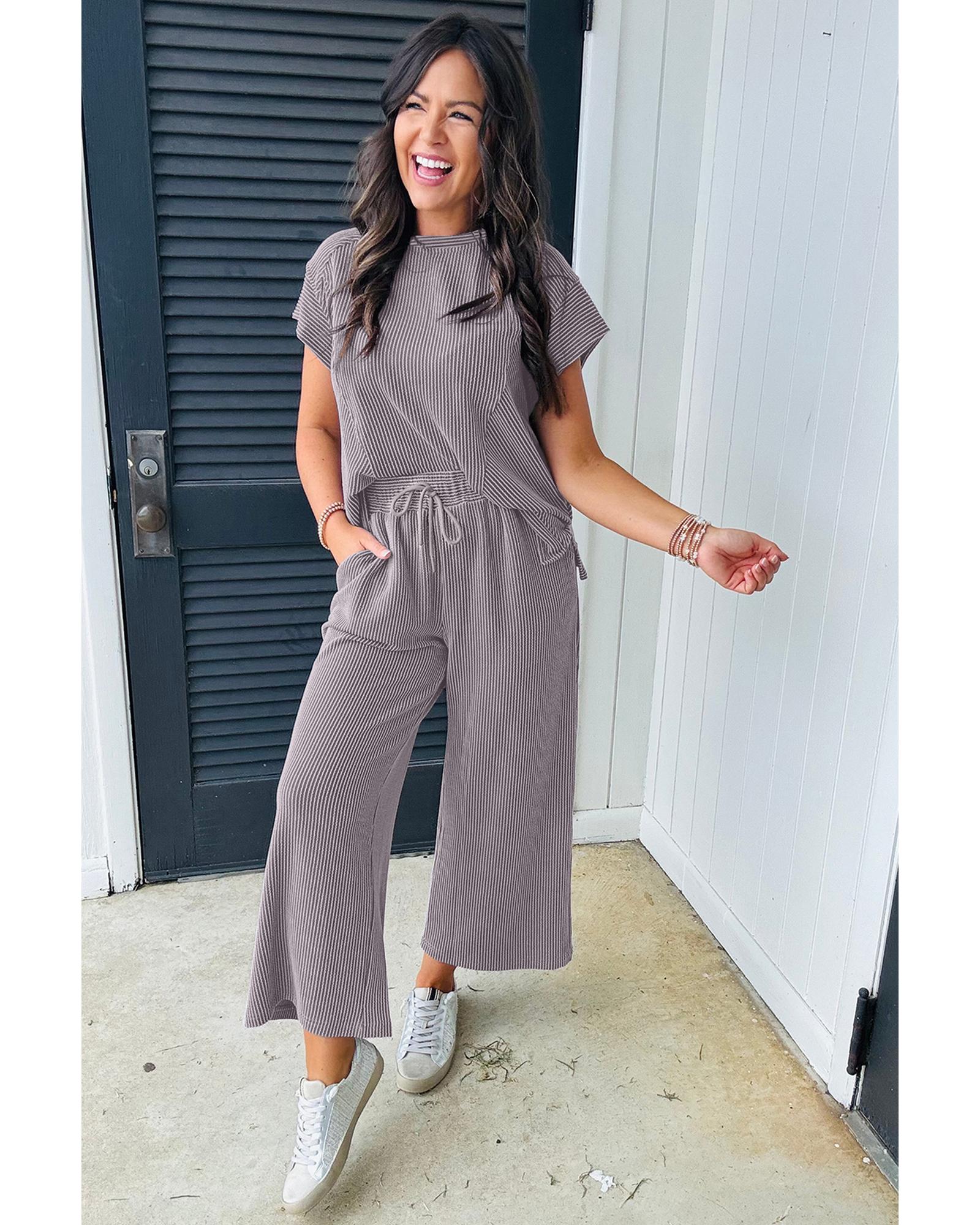 Wild Wind Solid Corded Knit Short Sleeve T Shirt and Wide Leg Pants Set – S