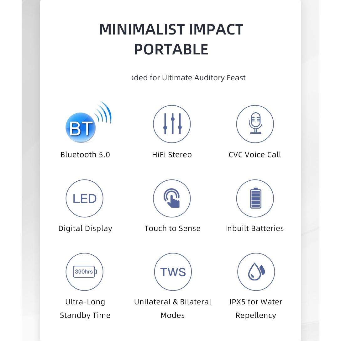 • 1 x T15P Bluetooth V5.0 Tws Ture Wireless Sports Led Display Headset With Charging Case Black