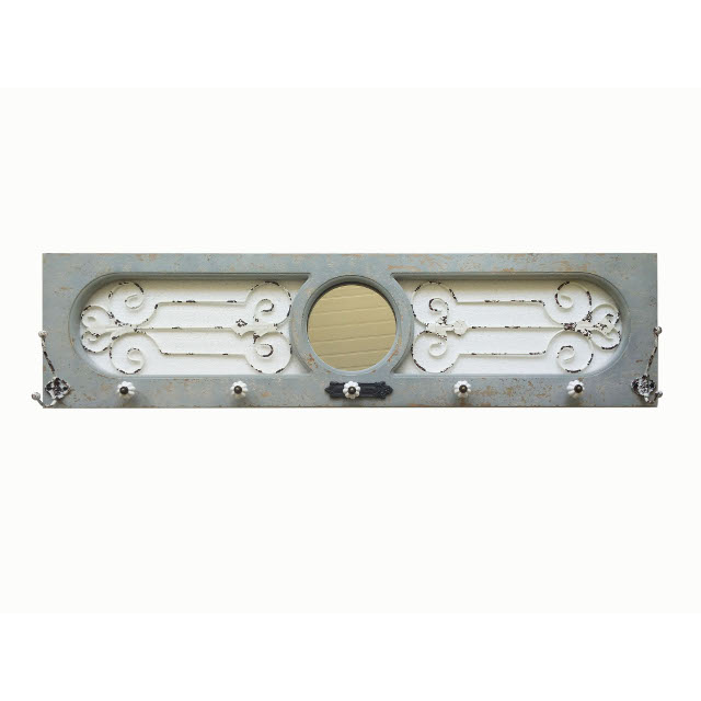A wooden wall mirror with hooks and metal inside design.