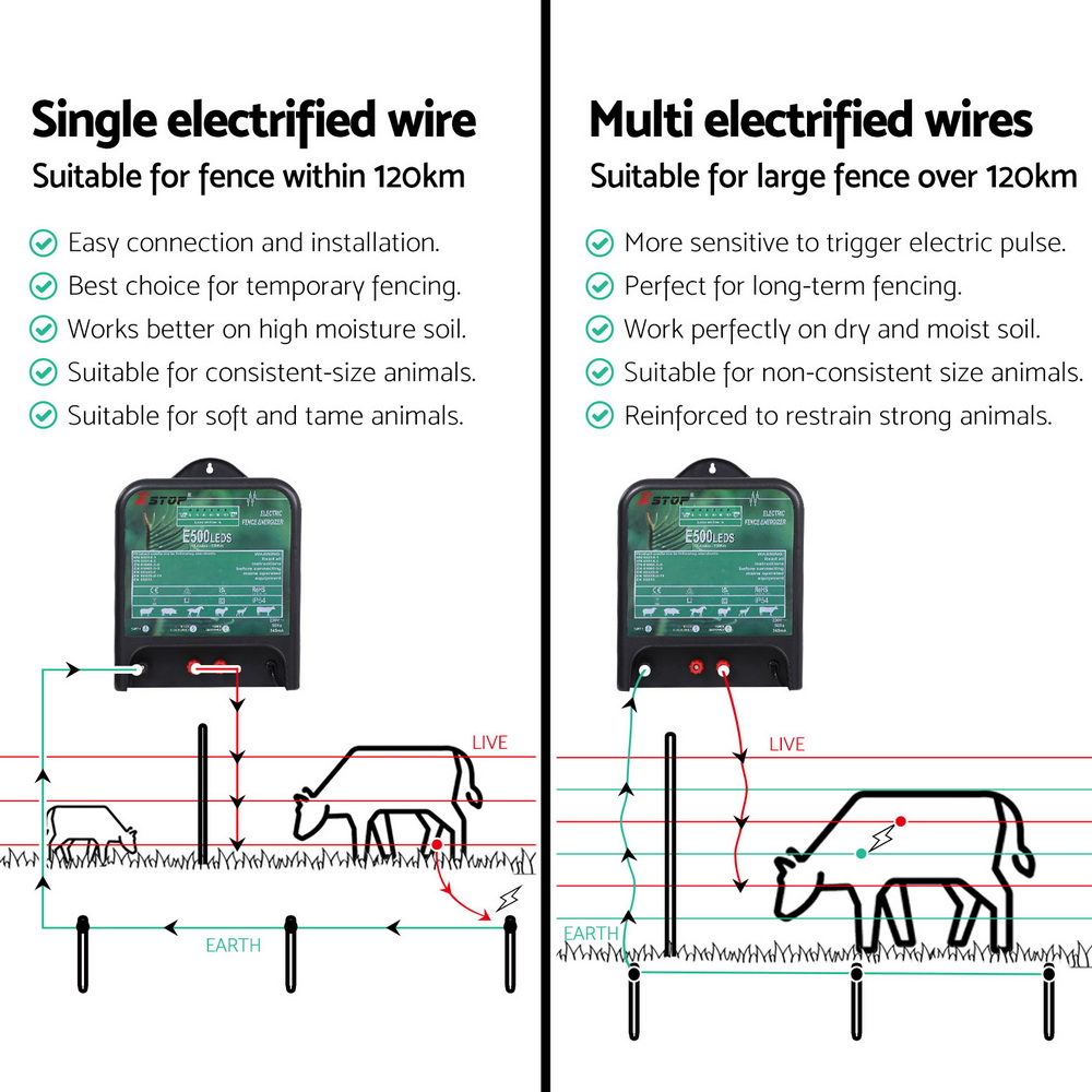 The XSTOP EL500LEDS Electric Fence Energiser designed for mains-powered operation (220V-240V AC), this robust energizer provides effective coverage up to 120km while maintaining energy efficiency at 430mA power consumption. Featuring IP54-rated weather resistance and clear LED status indicators, it ensures reliable performance in diverse conditions. With 5-joule output energy at 500 ohms and compliance with CE/ROHS standards, this unit offers durable protection against livestock breaches. Backed by a 12-month warranty, it’s an ideal choice for farms requiring dependable electric fencing solutions across extensive perimeters.