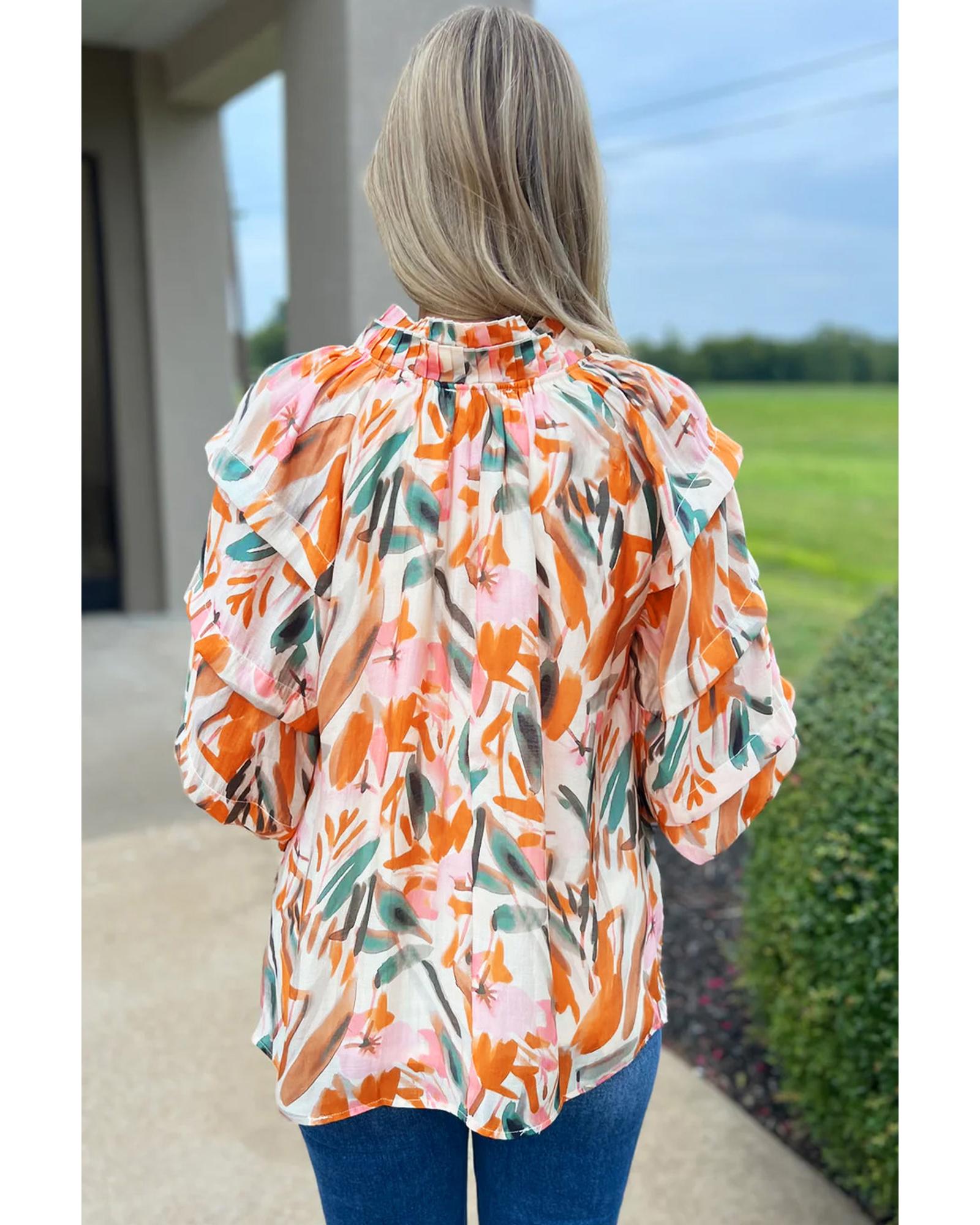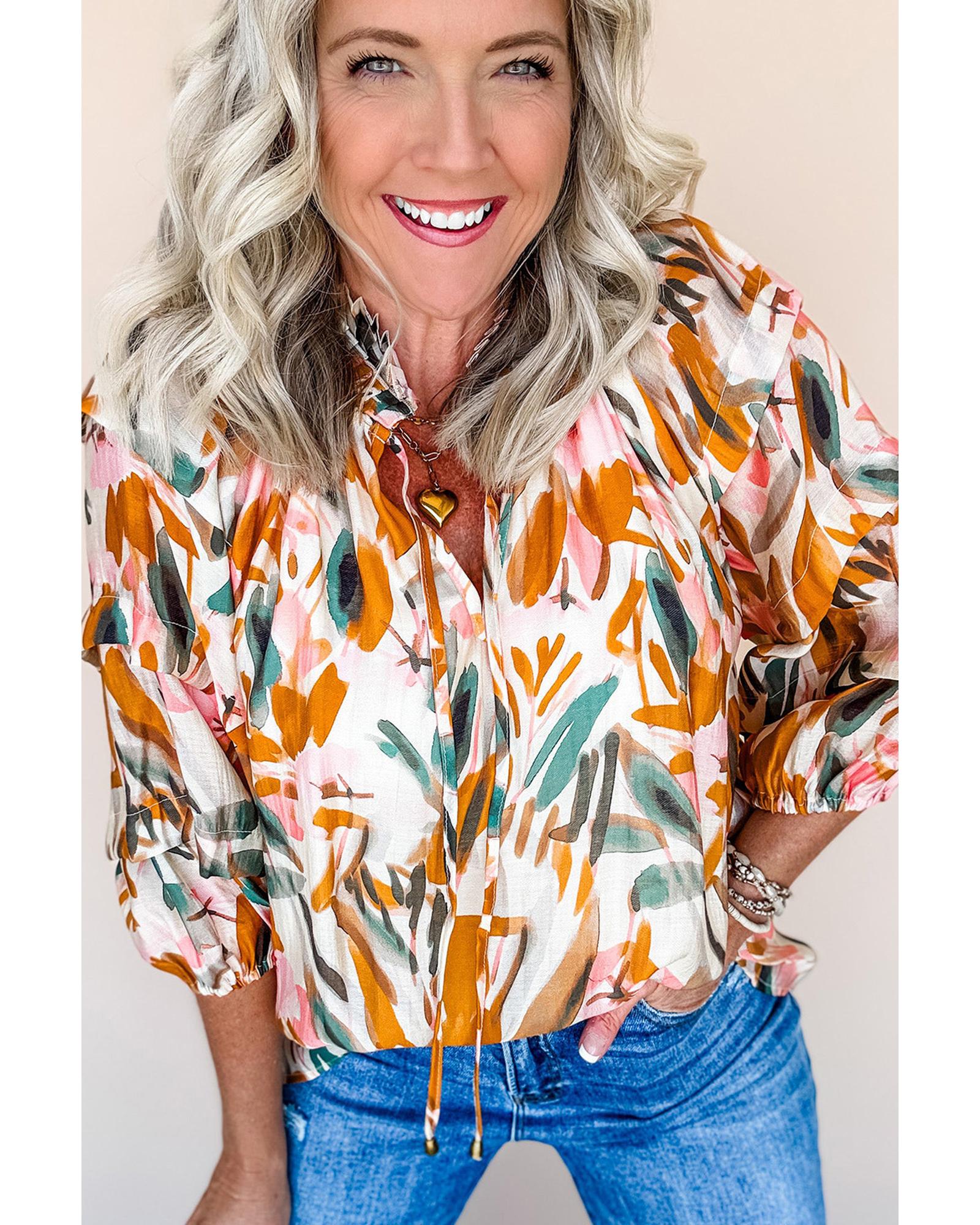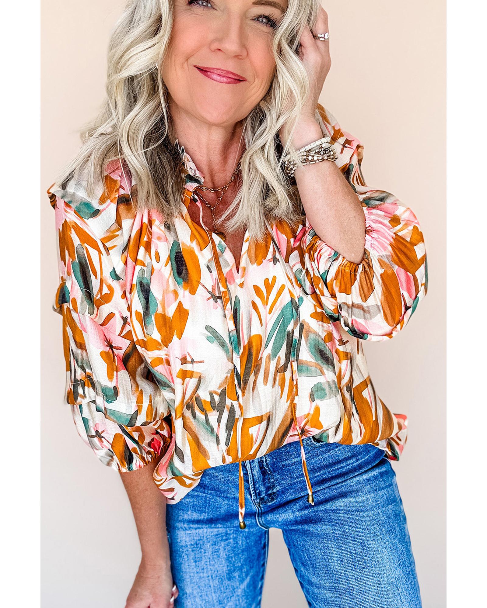 Yellow Abstract Print Drawstring Frilled V Neck 3/4 Sleeve Blouse – S