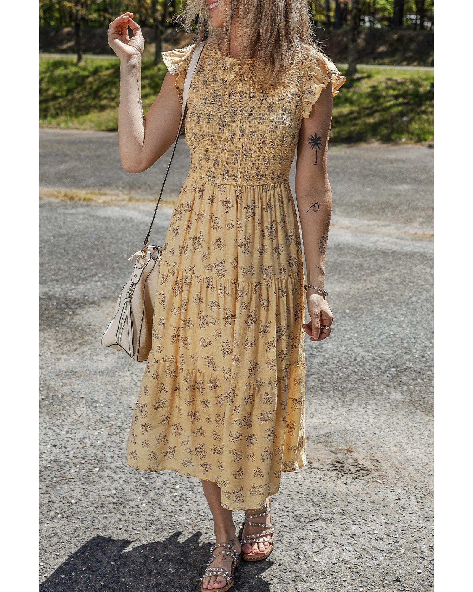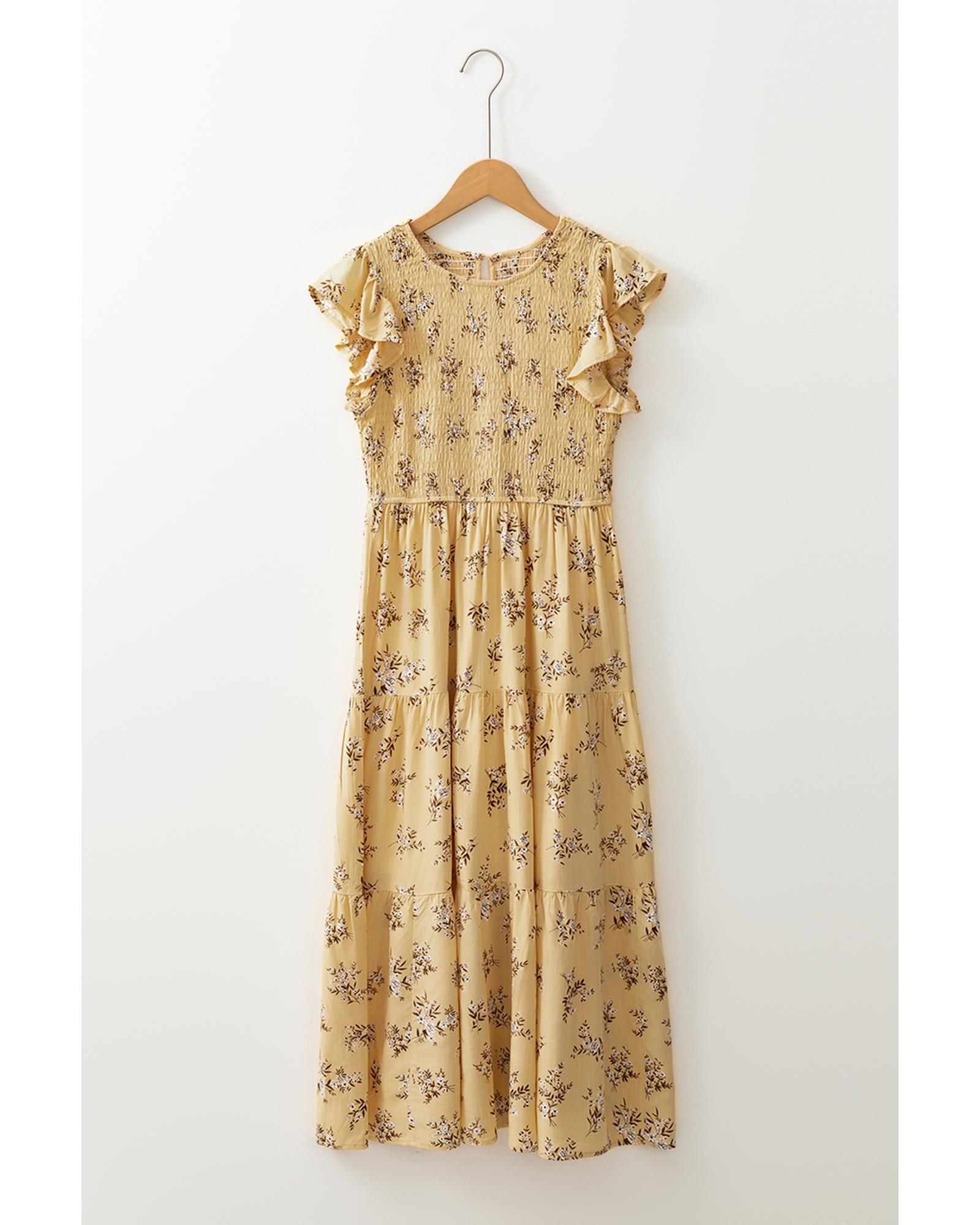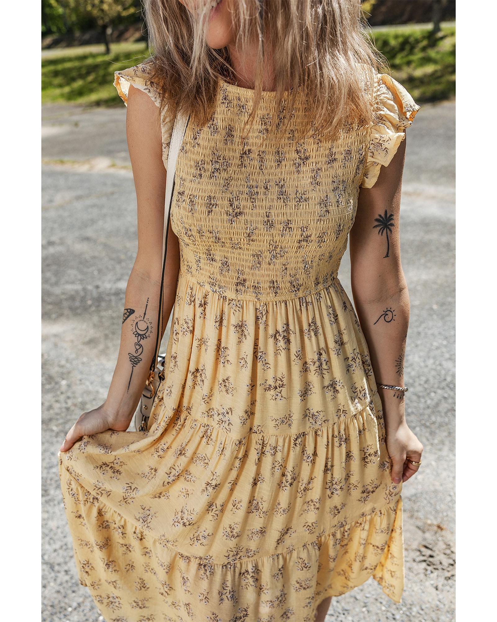 Yellow Boho Floral Print Ruffle Smocked Flowy Summer Dress – M