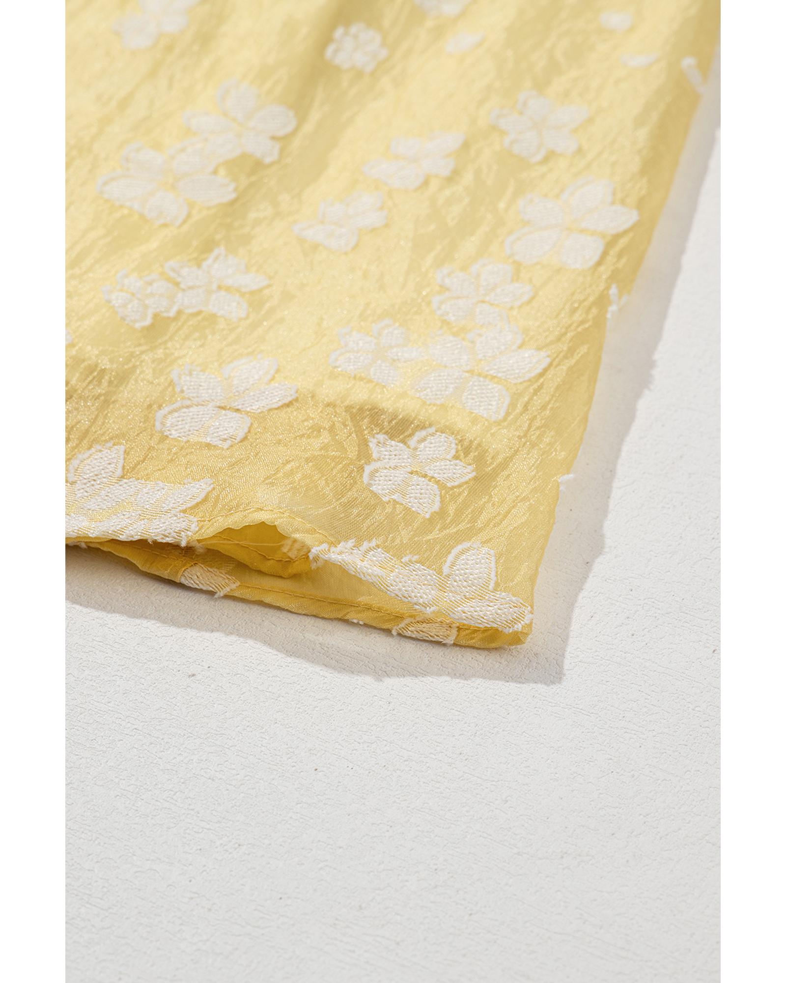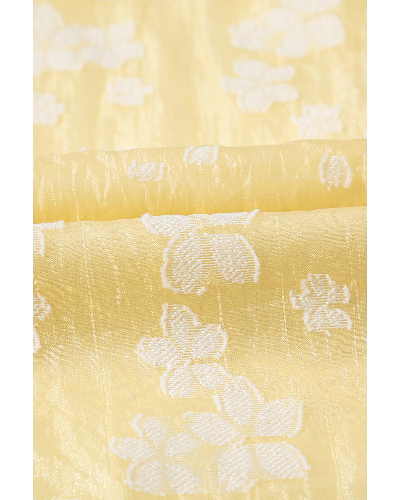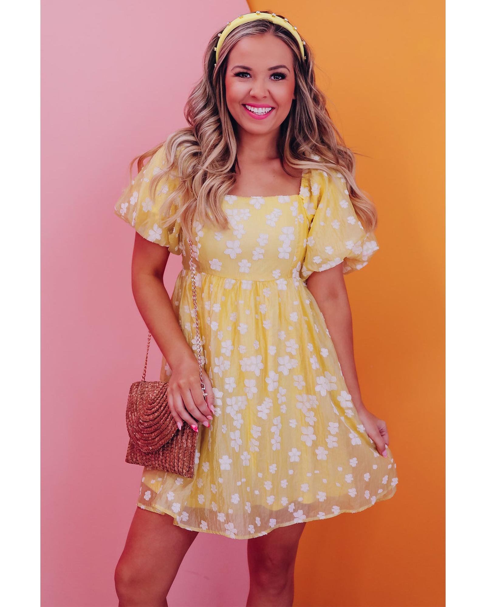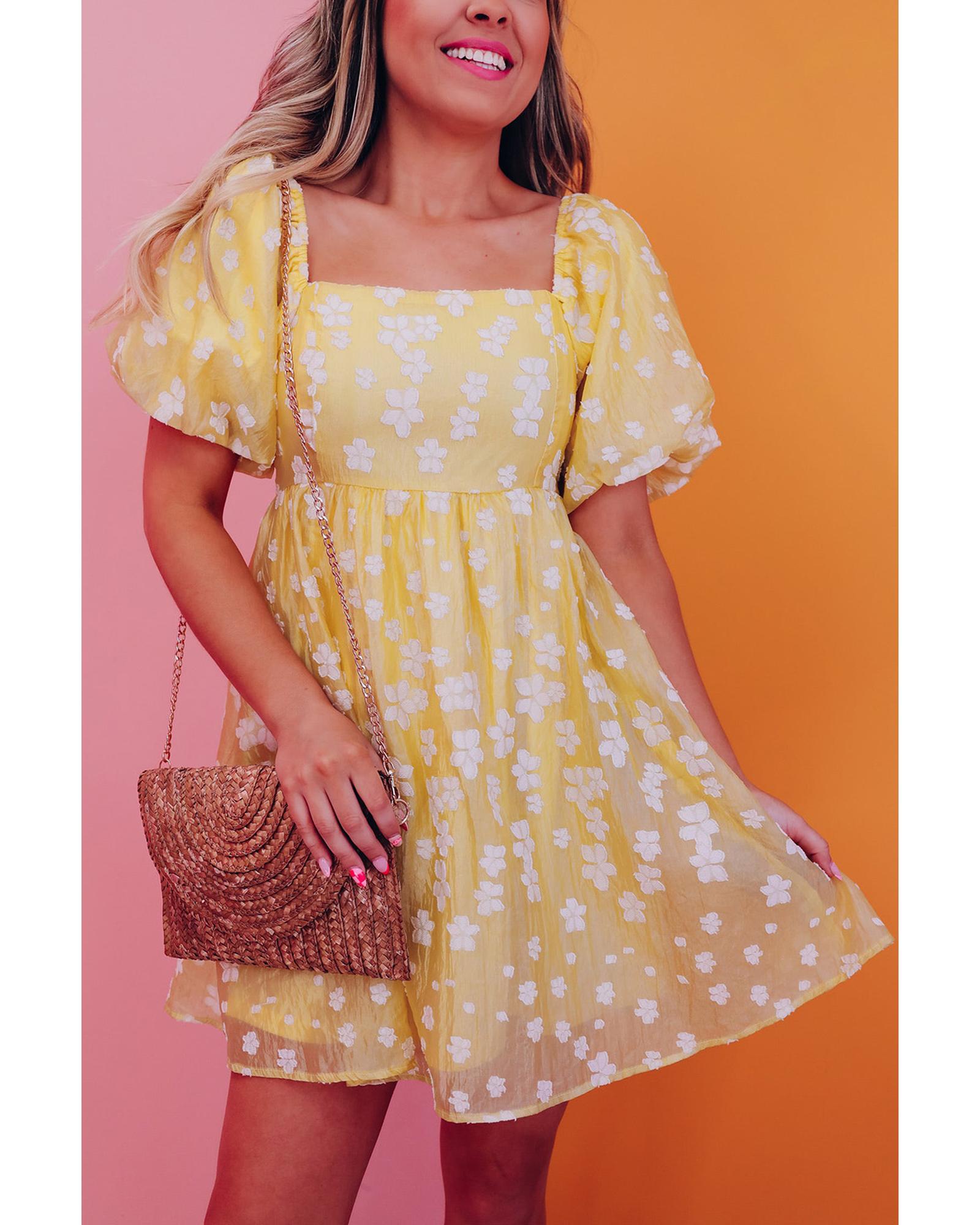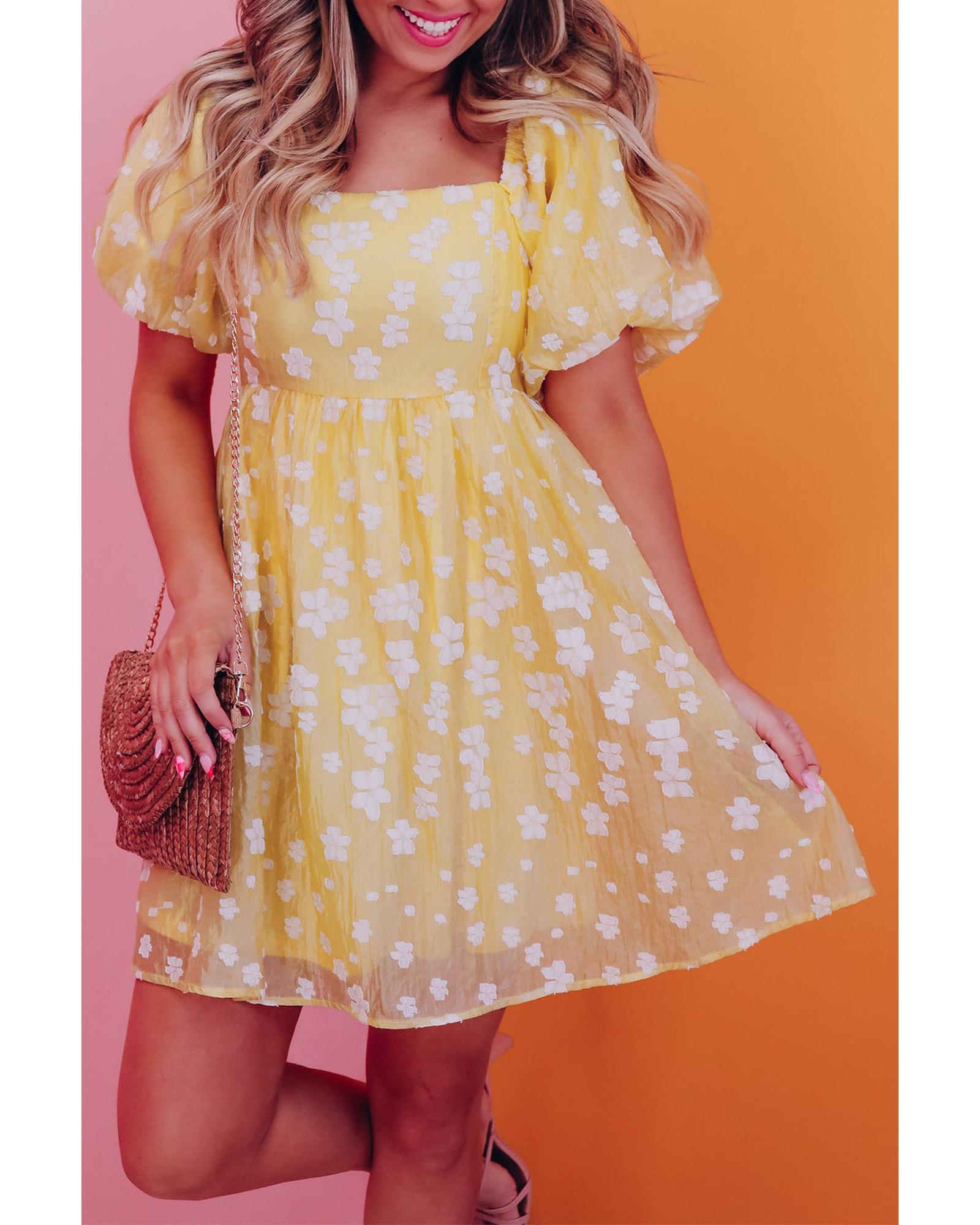 Yellow Boho Flower Jacquard Puff Sleeve Square Neck Mini Dress – XL