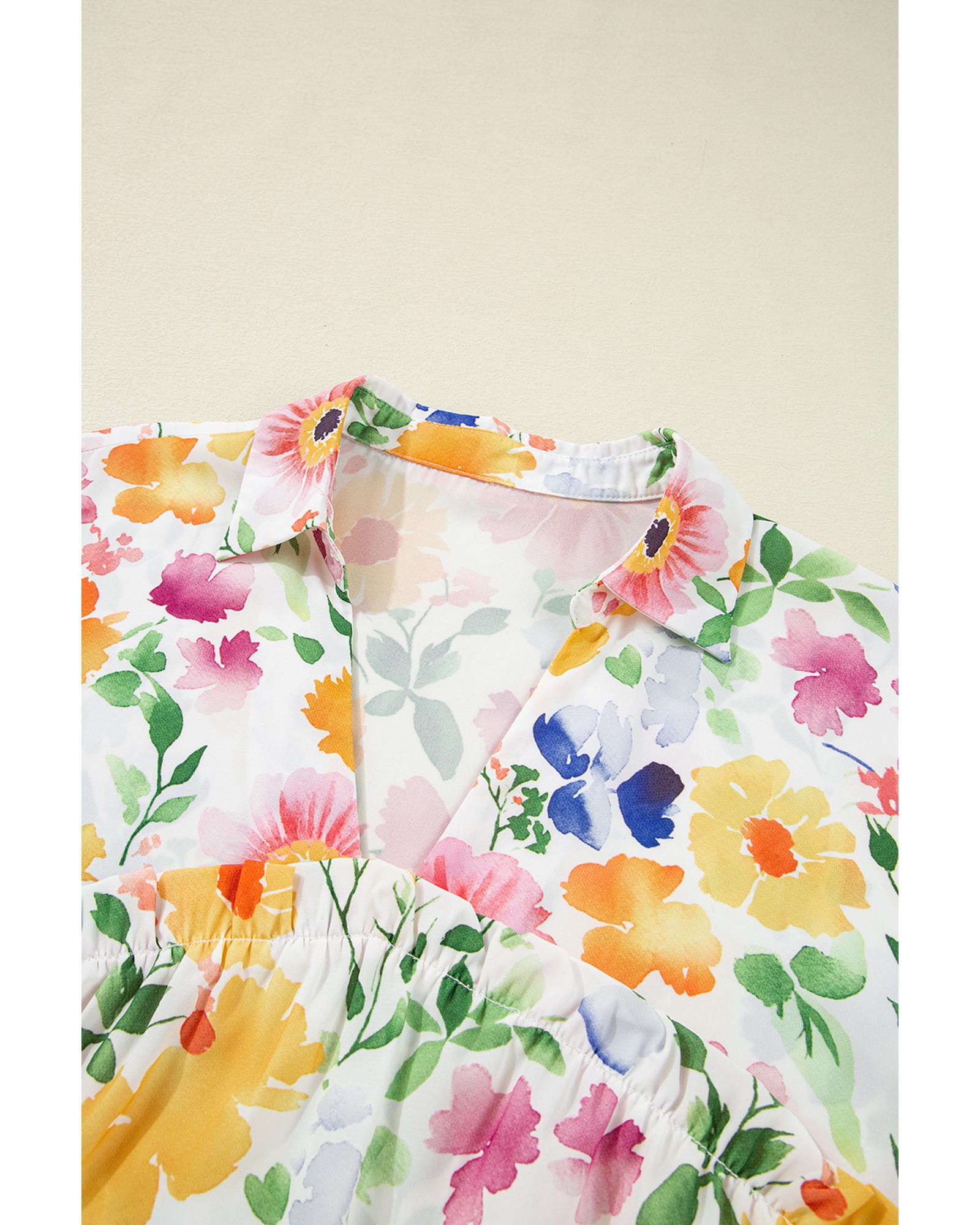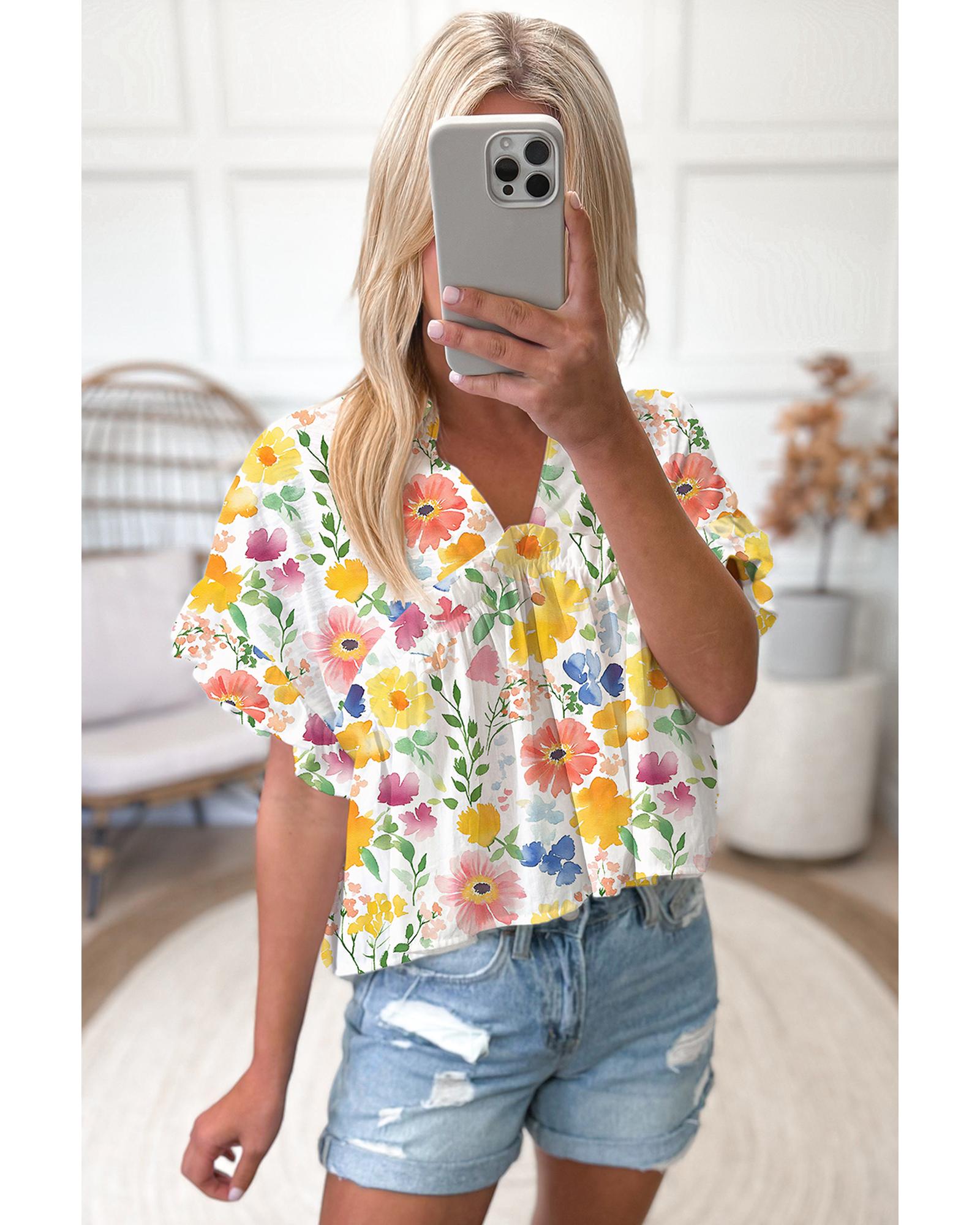 Yellow Floral Boxy Fit Ruffled Short Sleeve V Neck Blouse – XL