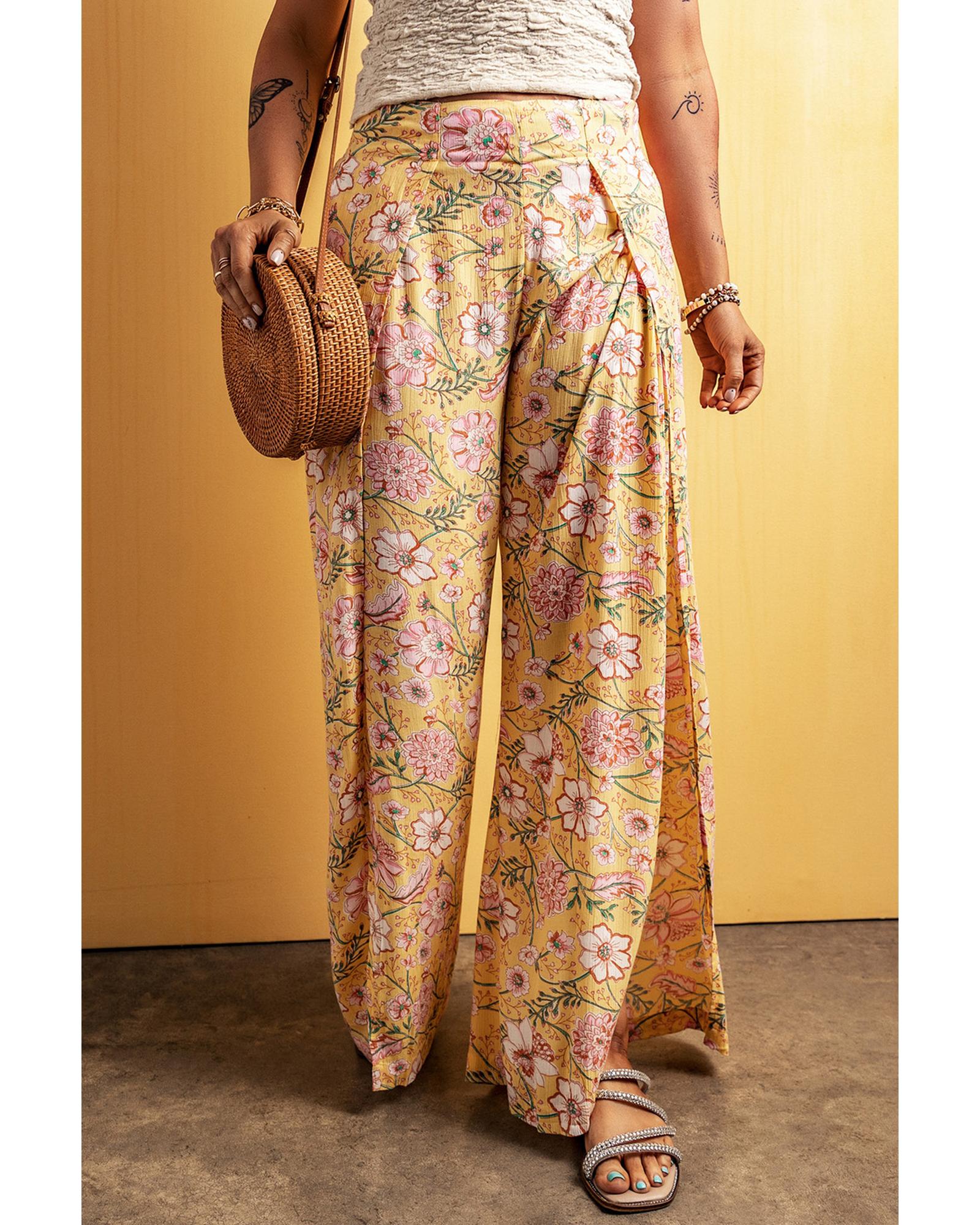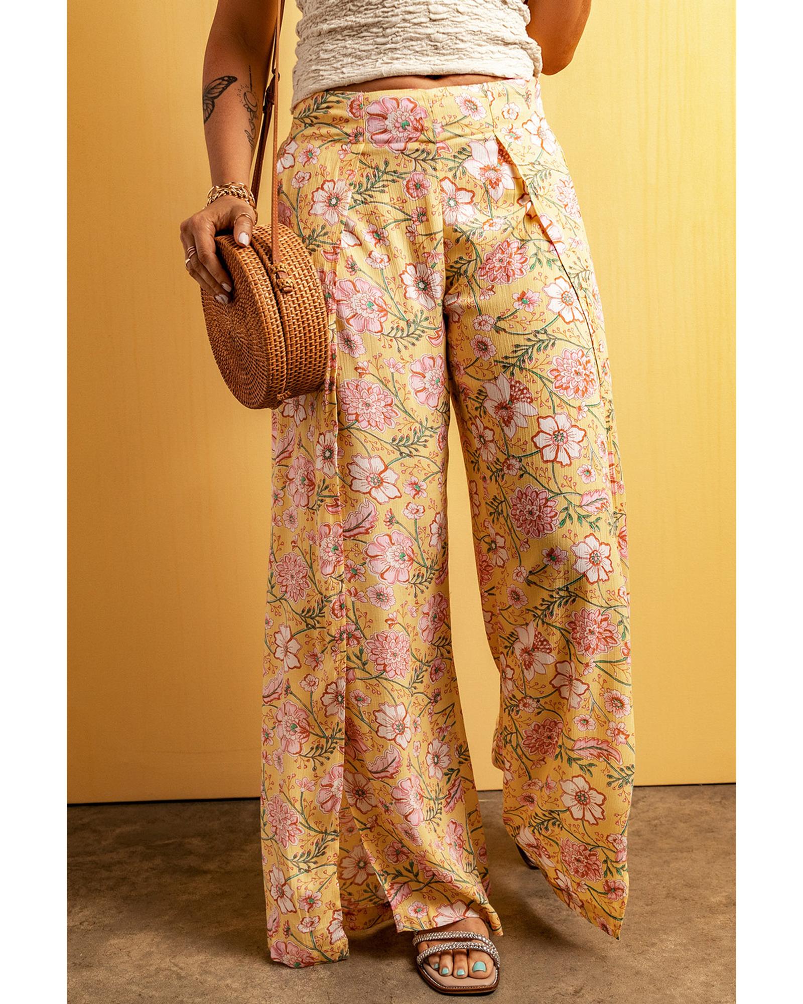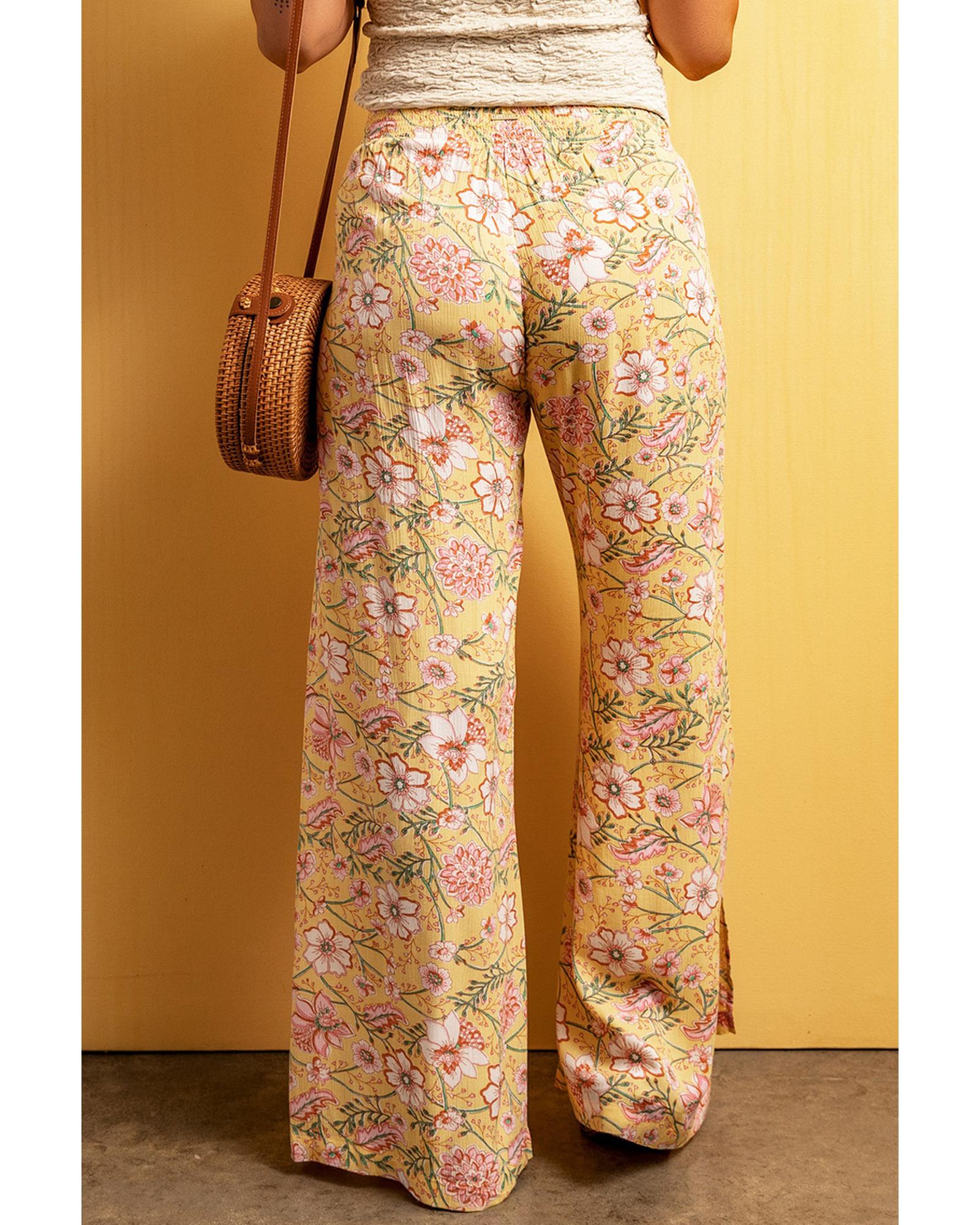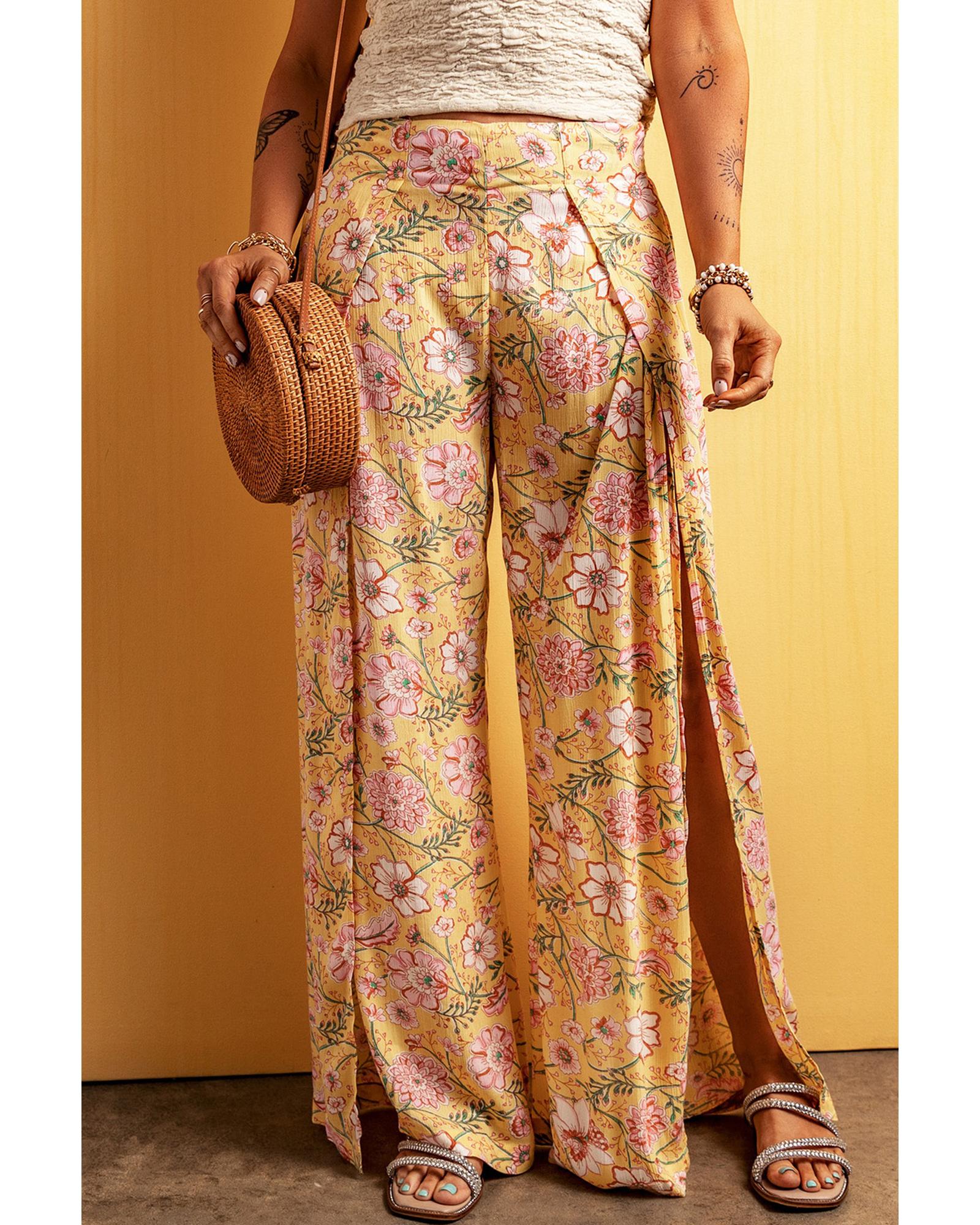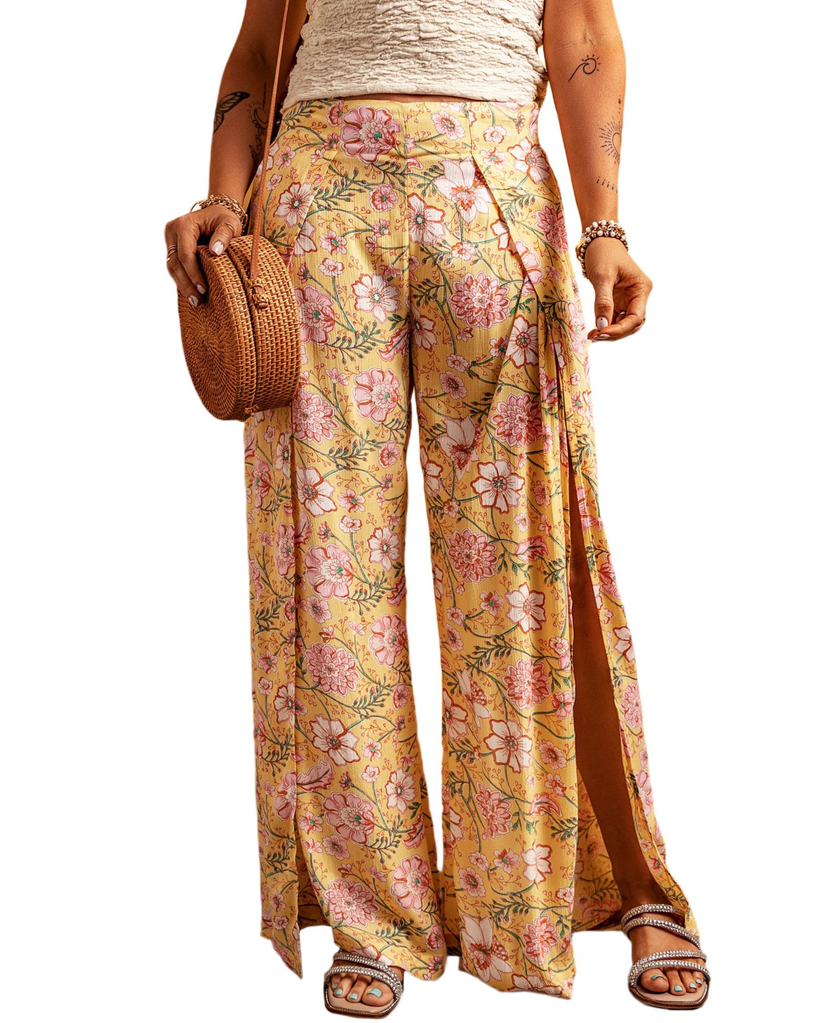 Yellow Floral Print High Slit Wide Leg Pants – M
