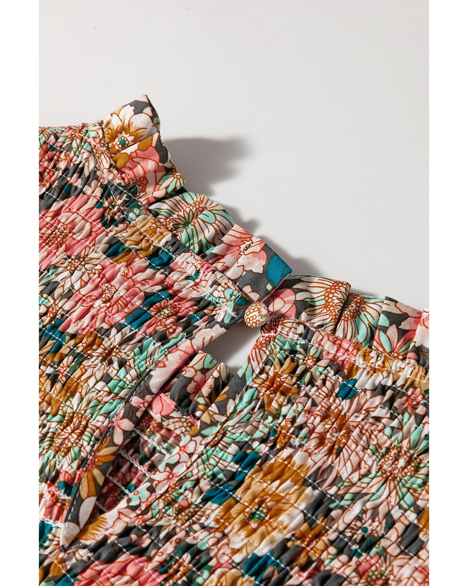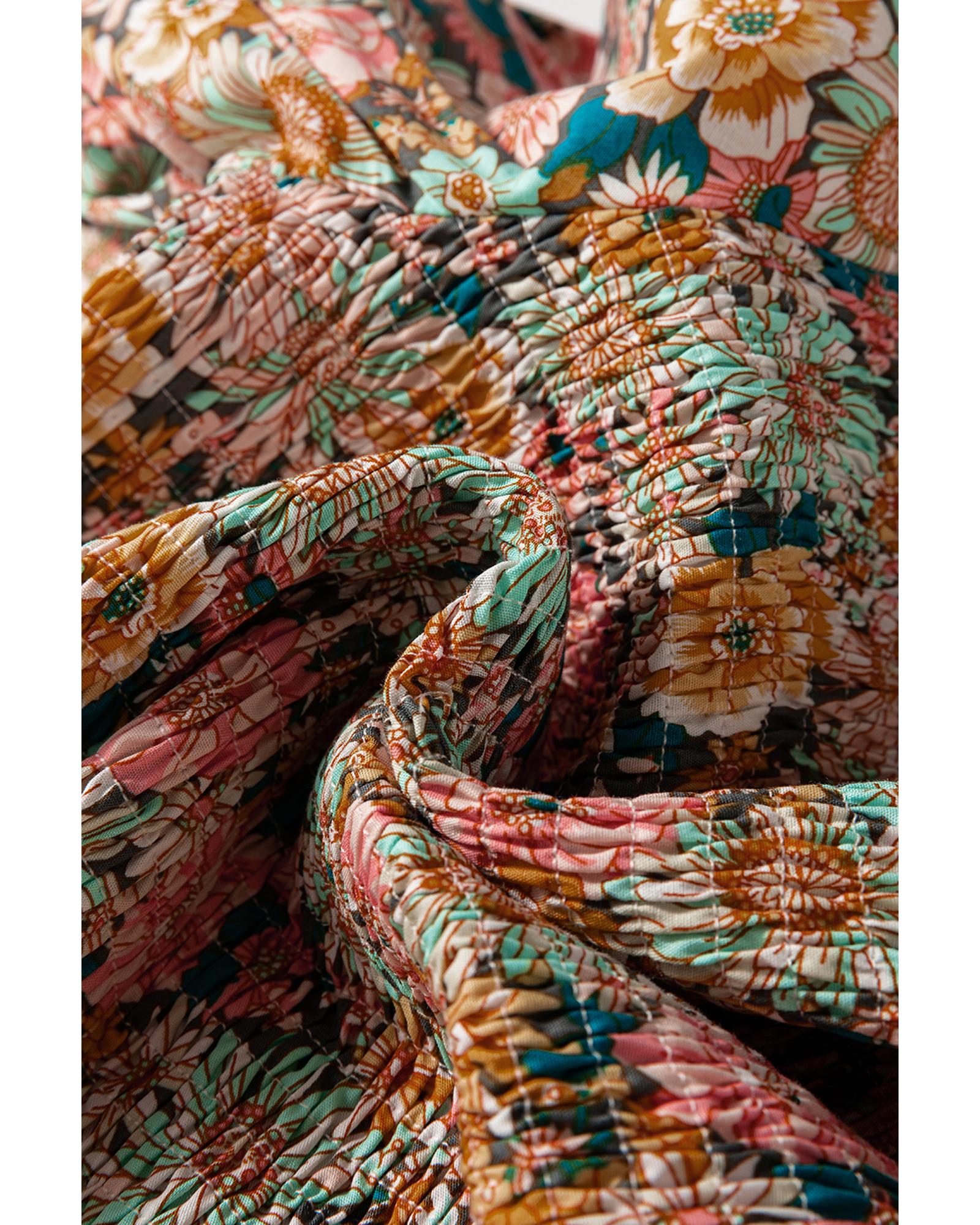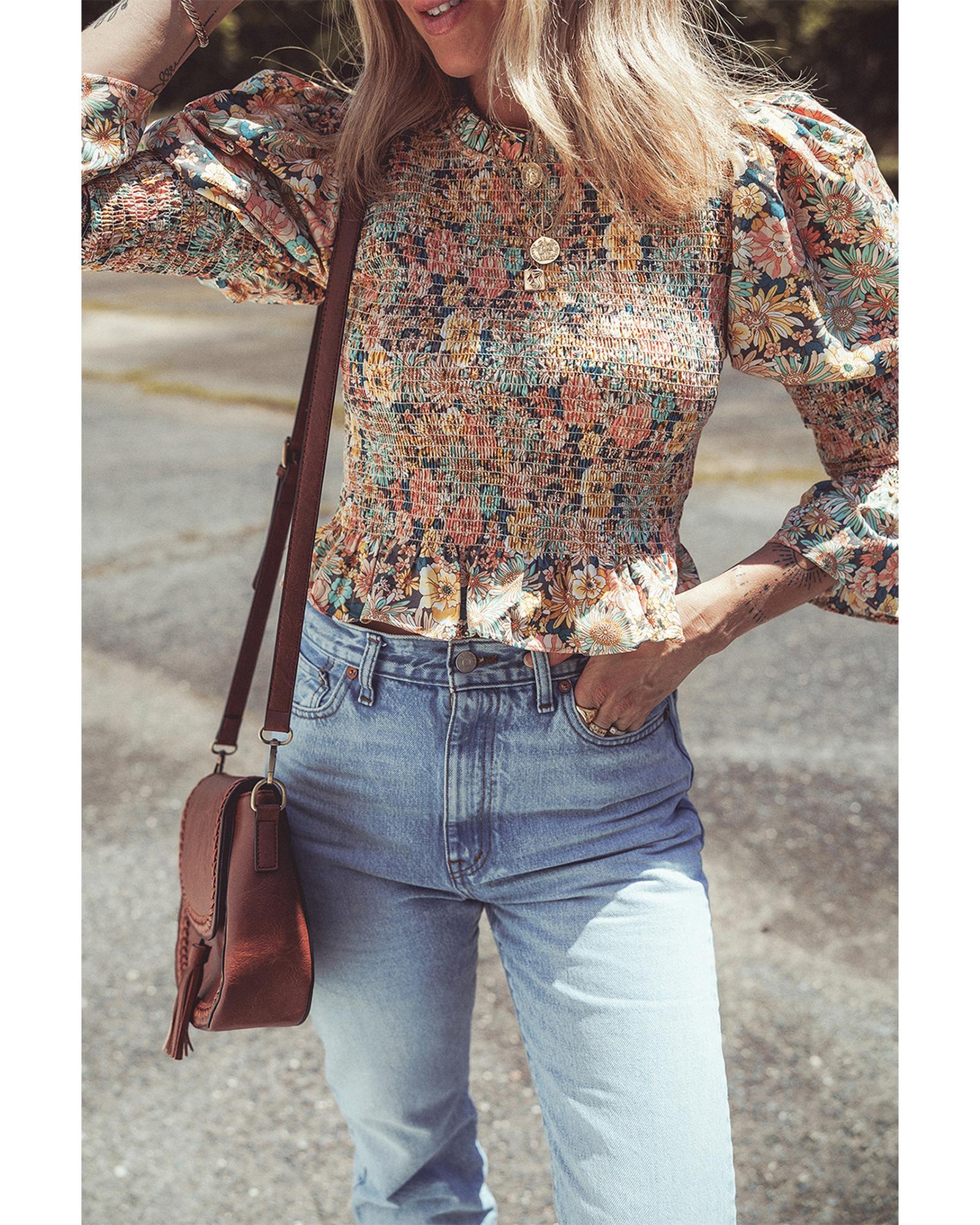Yellow Floral Print Smocked Bubble Sleeve Ruffled Crop Top – L
