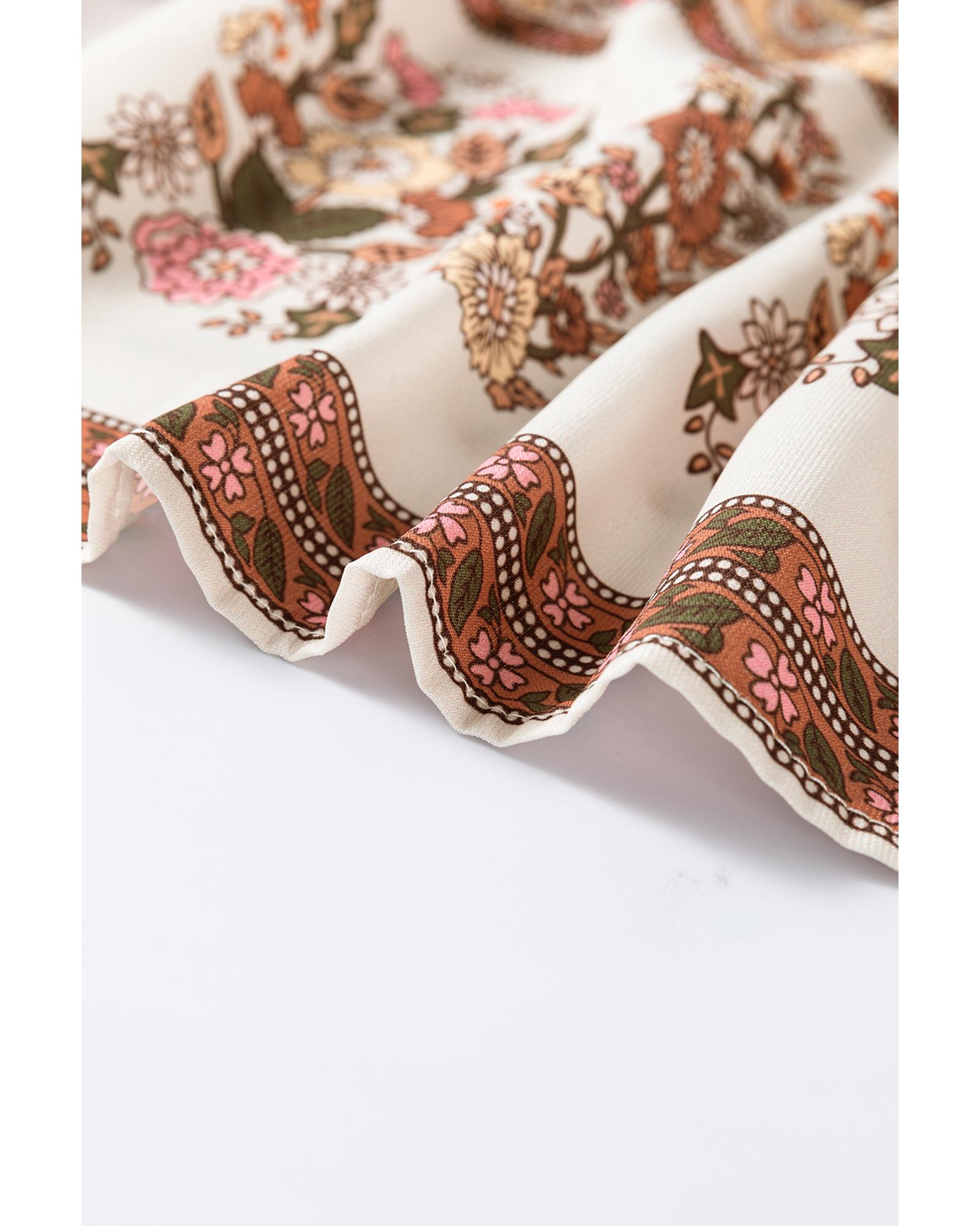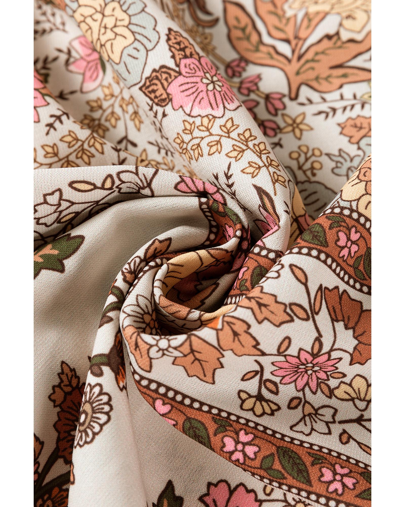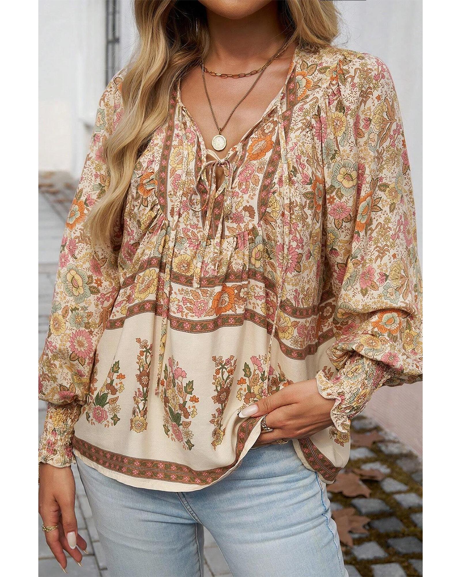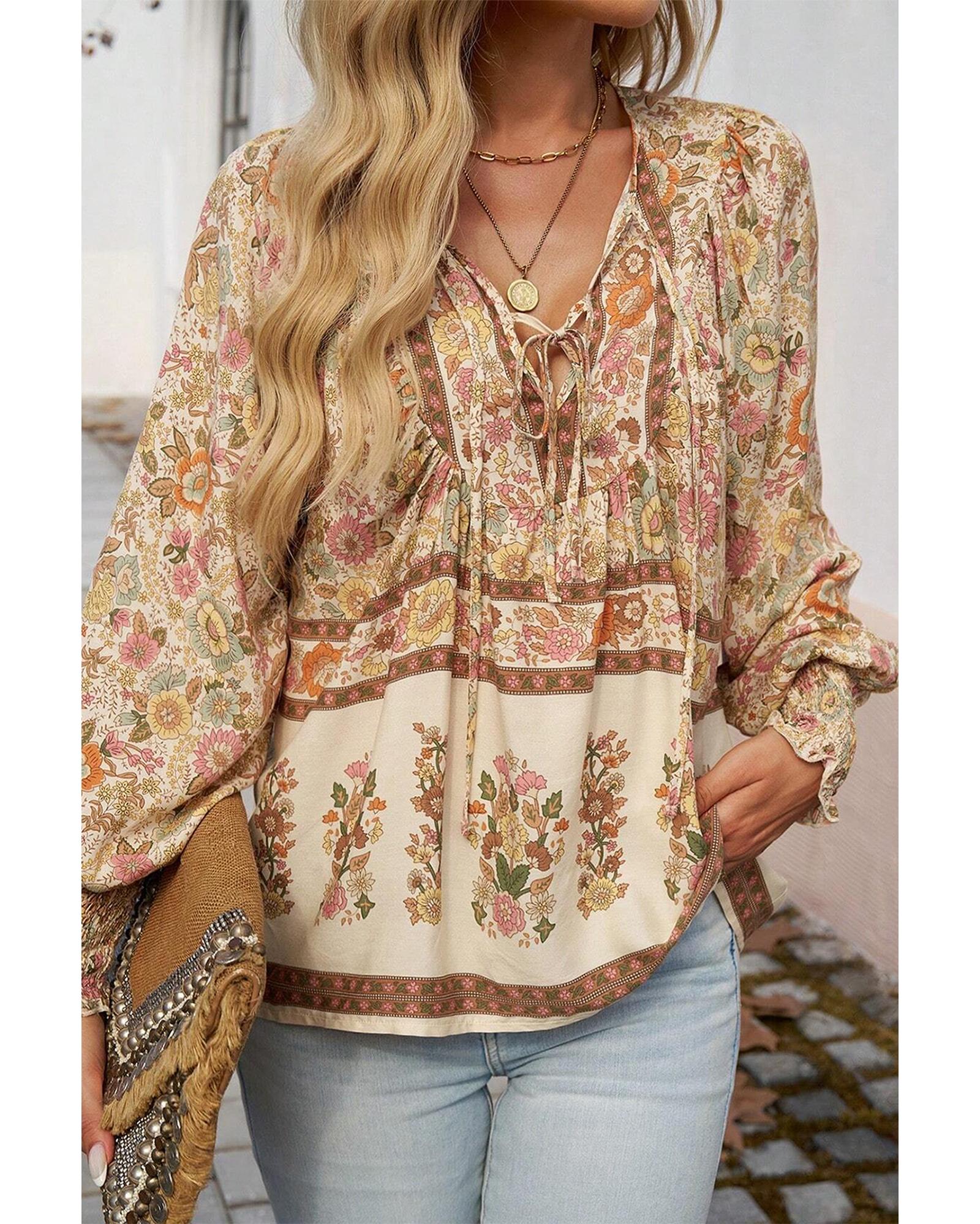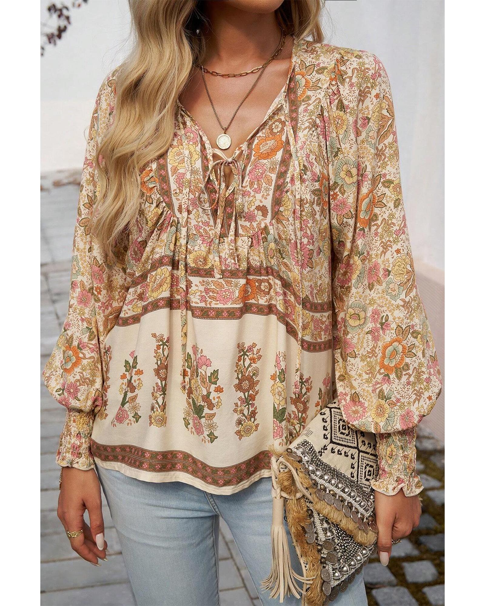 Yellow Floral Print Tie Neck Lantern Sleeve Blouse – S