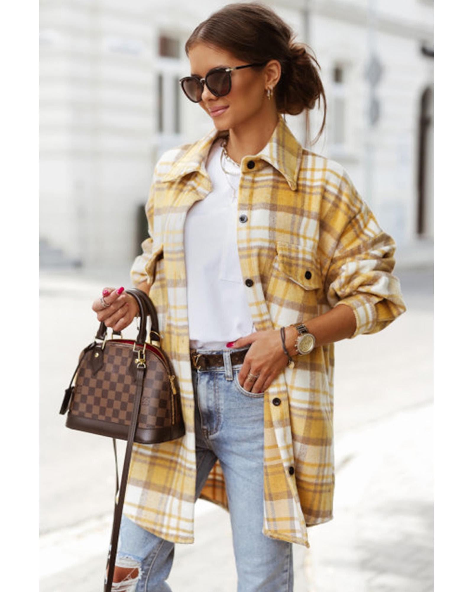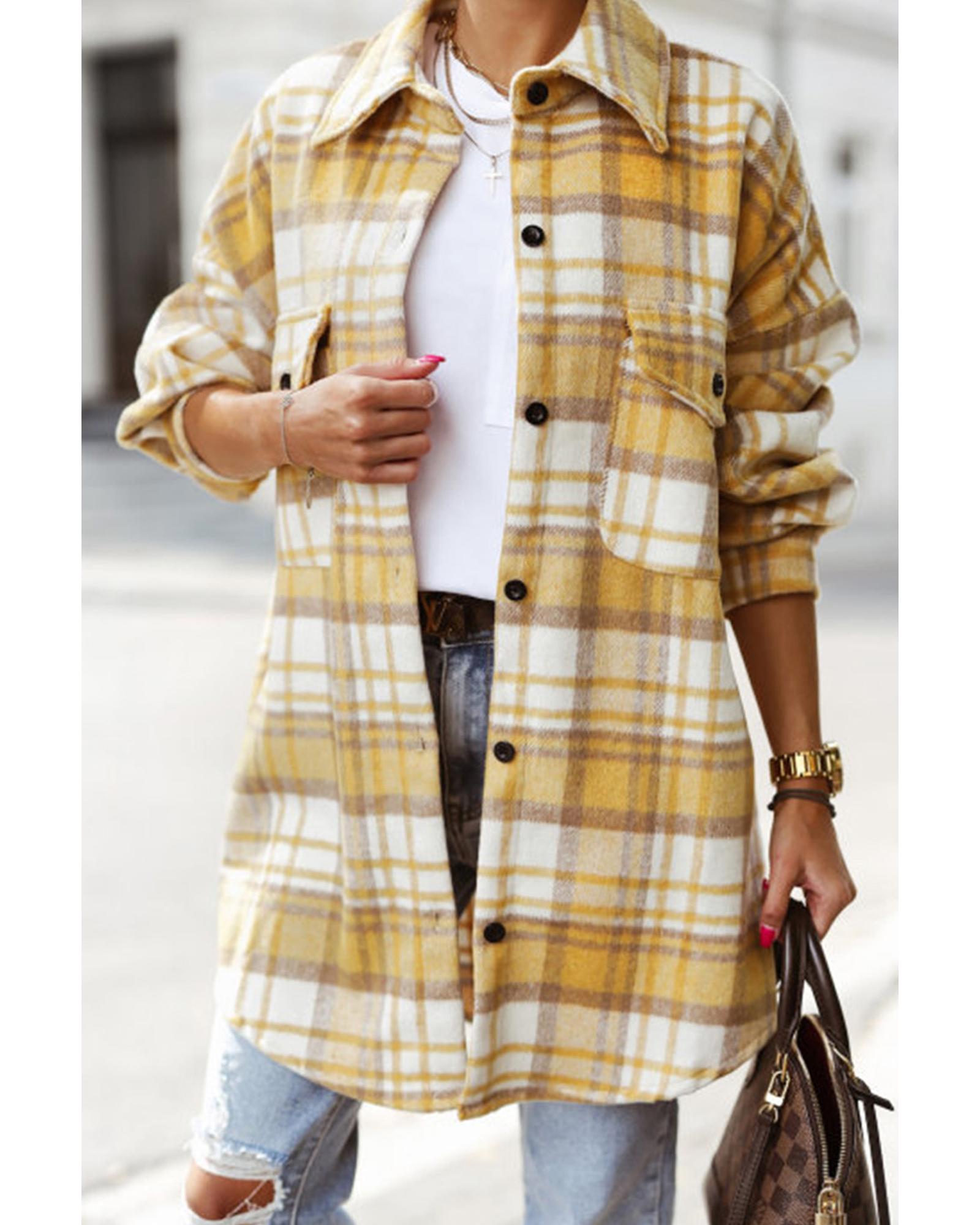 Yellow Plaid Flap Pocket Long Sleeve Shacket – M