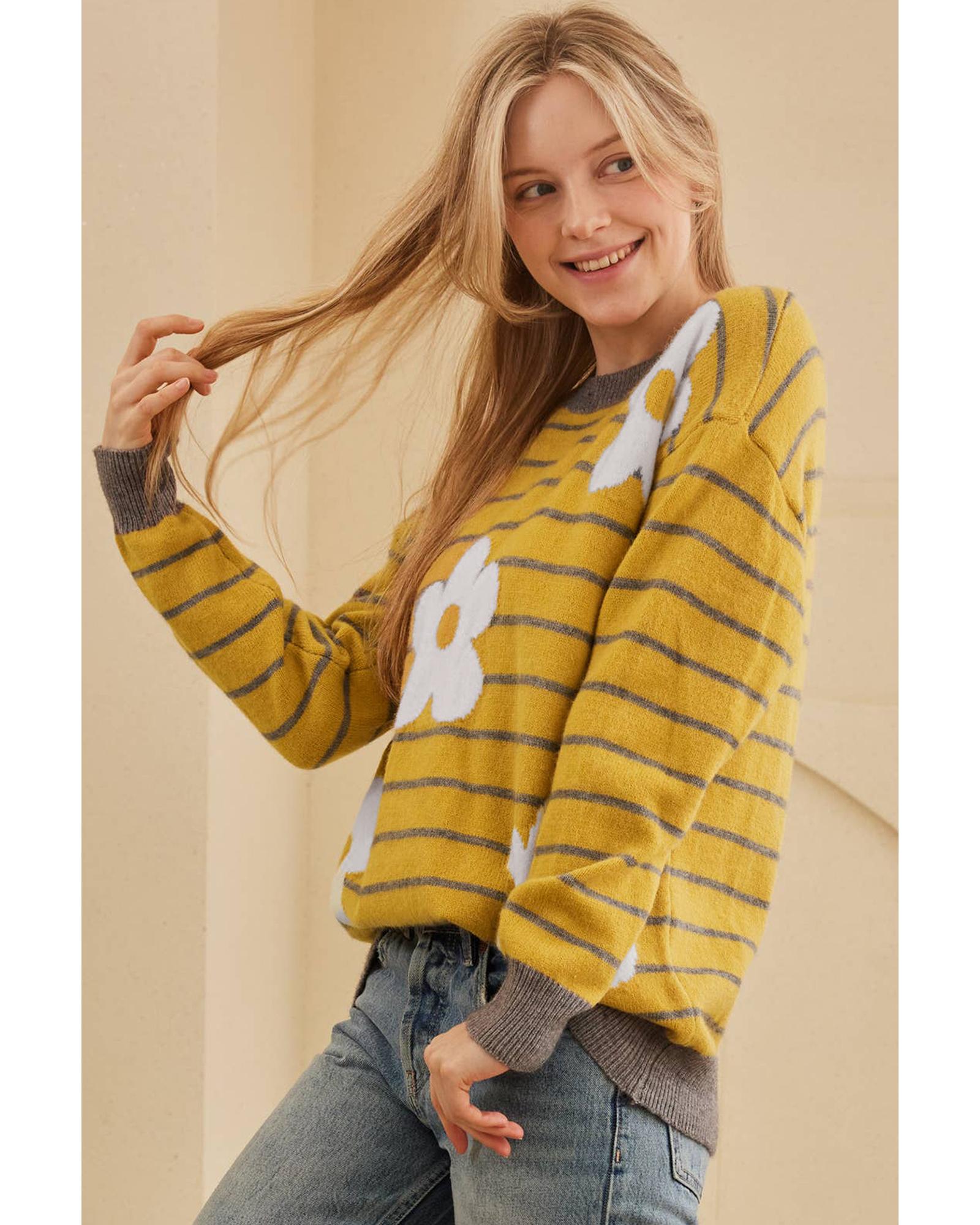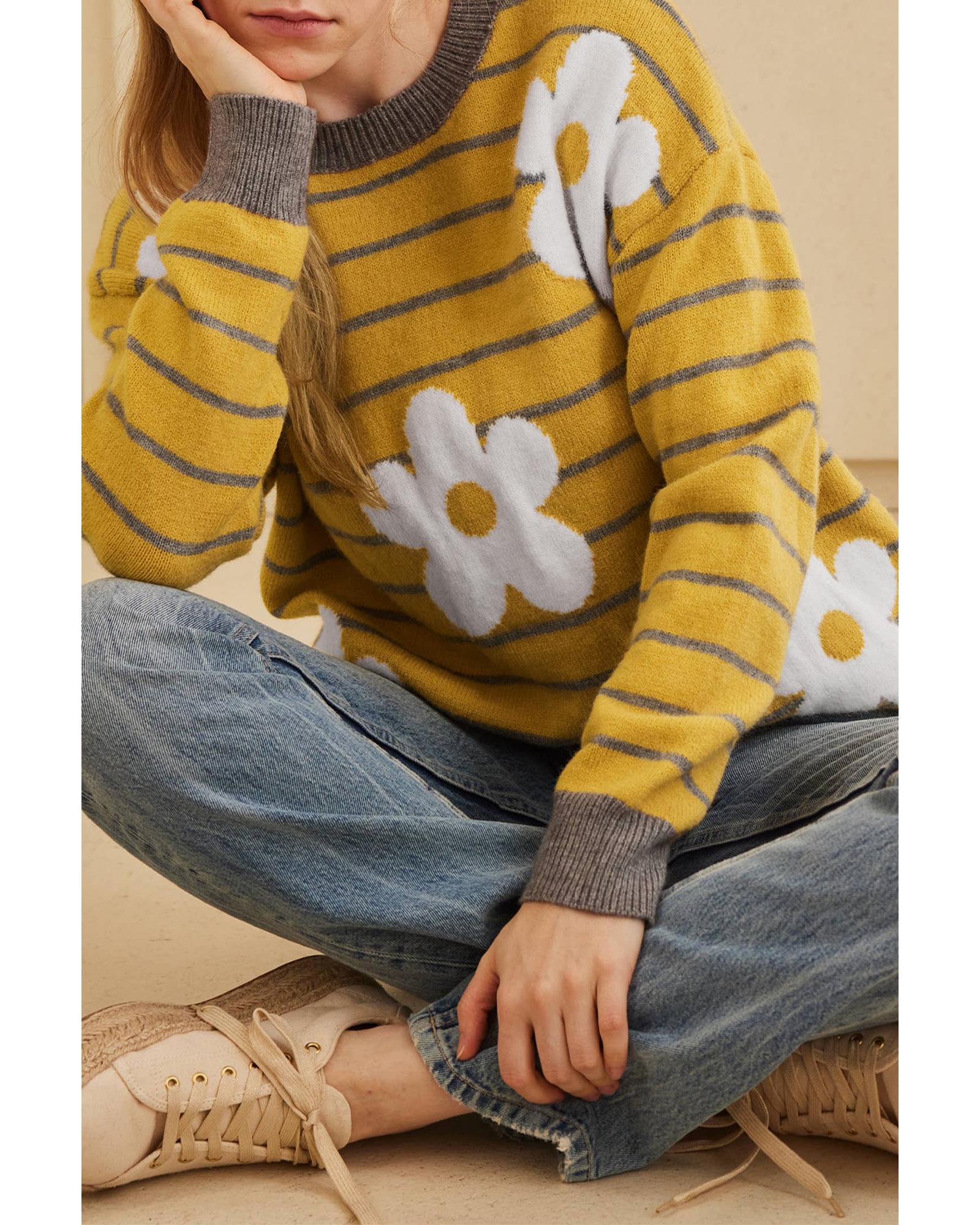 - Yellow Stripe Daisy Floral Knitted Round Neck Sweater
