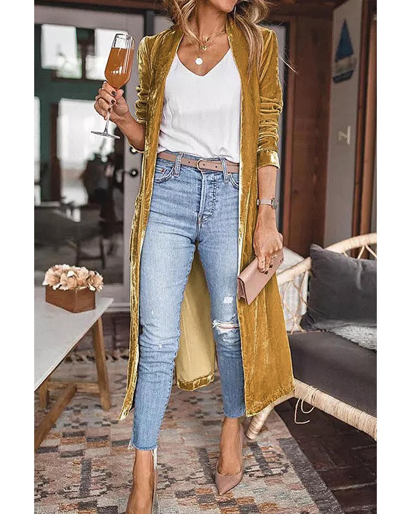 Yellow Velvet Open Front Pocketed Long Duster – 2XL