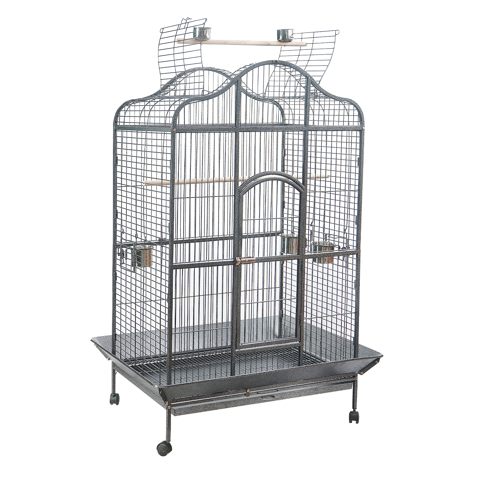 The birdcage is made of heavy-duty wrought Iron with a vein powder coated frame so it is tough and durable. The dimension of this cage is perfect for medium and large size birds and parrots. You can convert the cage to an open roof easily and let your bird perch up high. This brand new Open Top bird cage comes with seed skirts all around the cage, a large access door, side small access windows for stainless steel food/ water trays, 2 timber perches (one with 2 stainless steel feeders for the open roof), and removable tray for easy cleanup. The castor wheels are equipped on the matching stand provides great mobility.