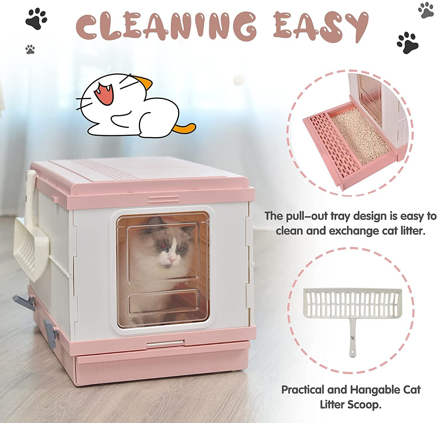 XL Portable Cat Toilet Litter Box Tray Foldable House with Handle and Scoop-Pink